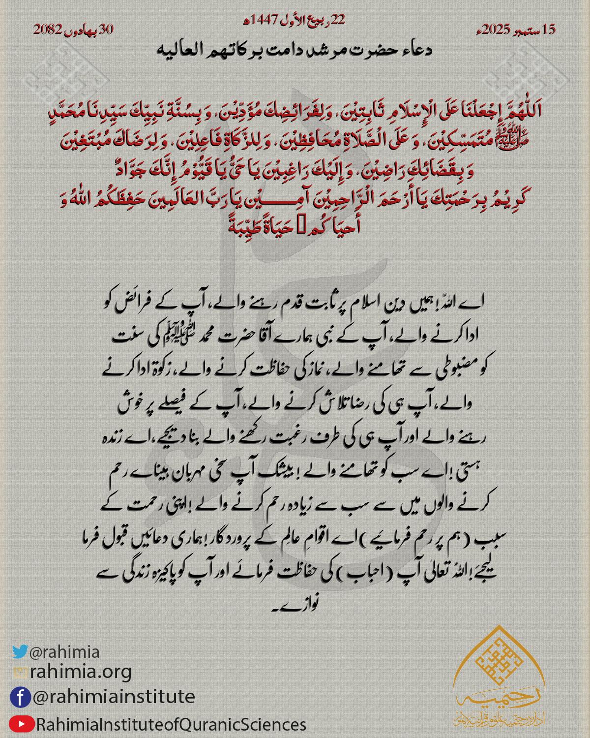 اَللّٰهُمَّ إِجْعَلْنَا عَلَی الْإِسْلَامِ ثَابِتِیْنَ، وَلِفَرَائِضِكَ مُؤَدِّیْنَ، وَ بِسُنَّةِ نَبِیِّكَ سَیِّدِنَا مُحَمَّدٍ ﷺ مُتَمَسِّکِیْنَ، وَ عَلَی الْصَّلَاةِ مُحَافِظِیْنَ، وَ لِلزَّکَاةِ فَاعِلِیْنَ، وَ لِرَضَ…