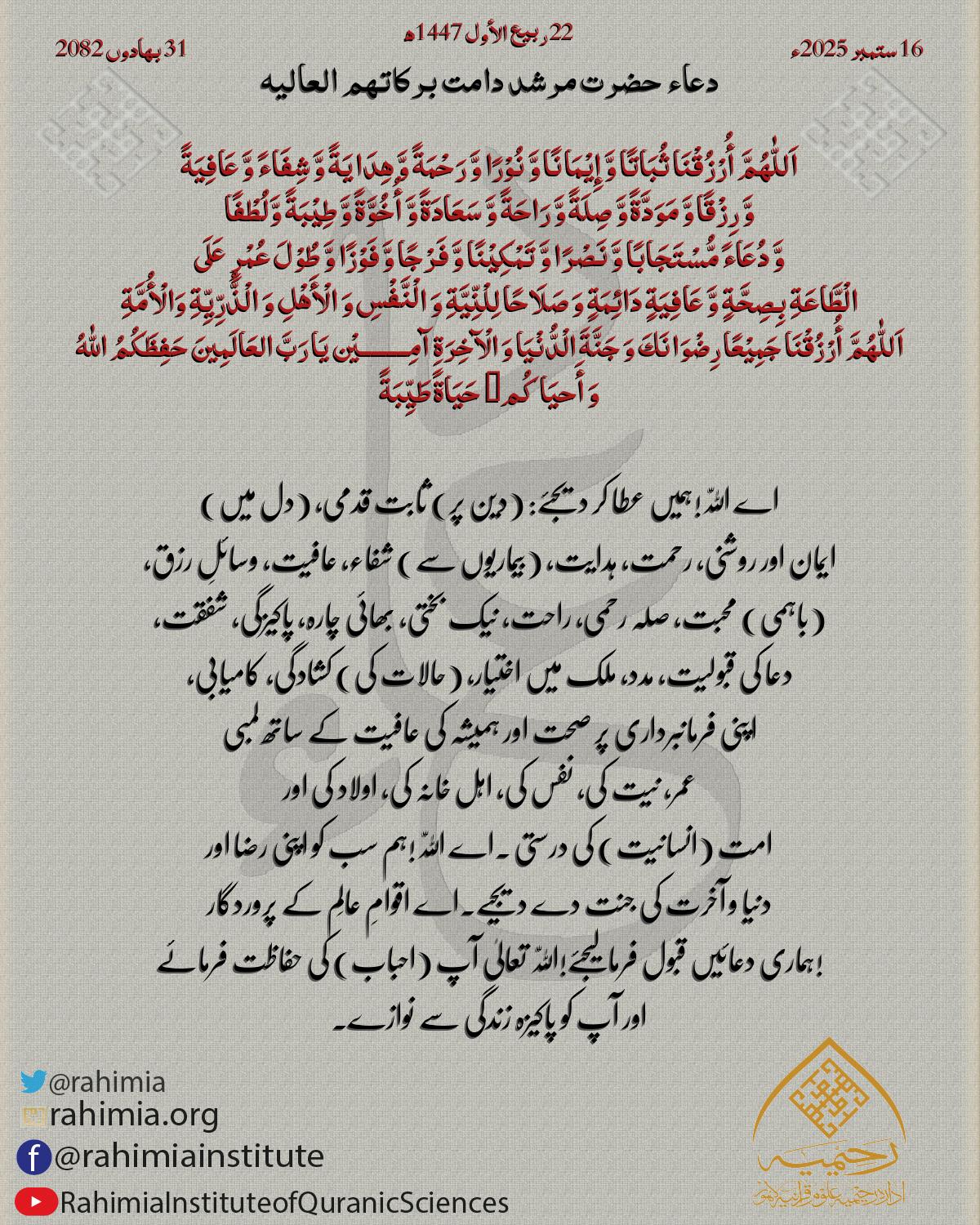 اَللّٰهُمَّ أُرْزُقْنَا ثُبَاتًا وَّ إِیْمَانًا وَّ نُوْرًا وَّ رَحْمَةً وَّ ھِدَایَةً وَّ شِفَاءً وَّ عَافِیَةً وَّ رِزْقًا وَّ مَوَدَّةً وَّ صِلَةً وَّ رَاحَةً وَّ سَعَادَةً وَّ أُخُوَّةً وَّ طِیْبَةً وَّلُطْفًا وَّ دُعَاءً …