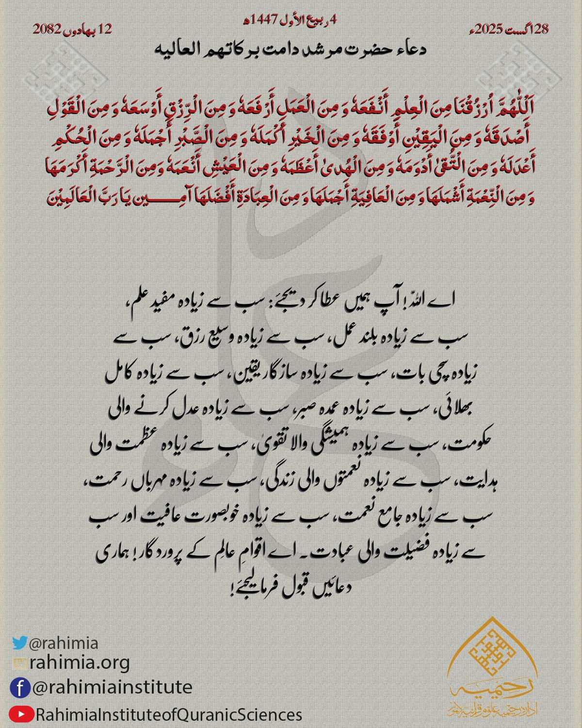 اَلْلّٰهُمَّ اُرْزُقْنَا مِنَ الْعِلْمِ أَنْفَعَهٗ وَ مِنَ الْعَمَلِ أَرْفَعَهٗ وَ مِنَ الْرِّزْقِ أَوْسَعَهٗ وَ مِنَ الْقَوْلِ أَصْدَقَهٗ وَ مِنَ الْيَقِيْنِ أَوْفَقَهٗ وَ مِنَ الْخَيْرِ أَكْمَلَهٗ وَ مِنَ ا…