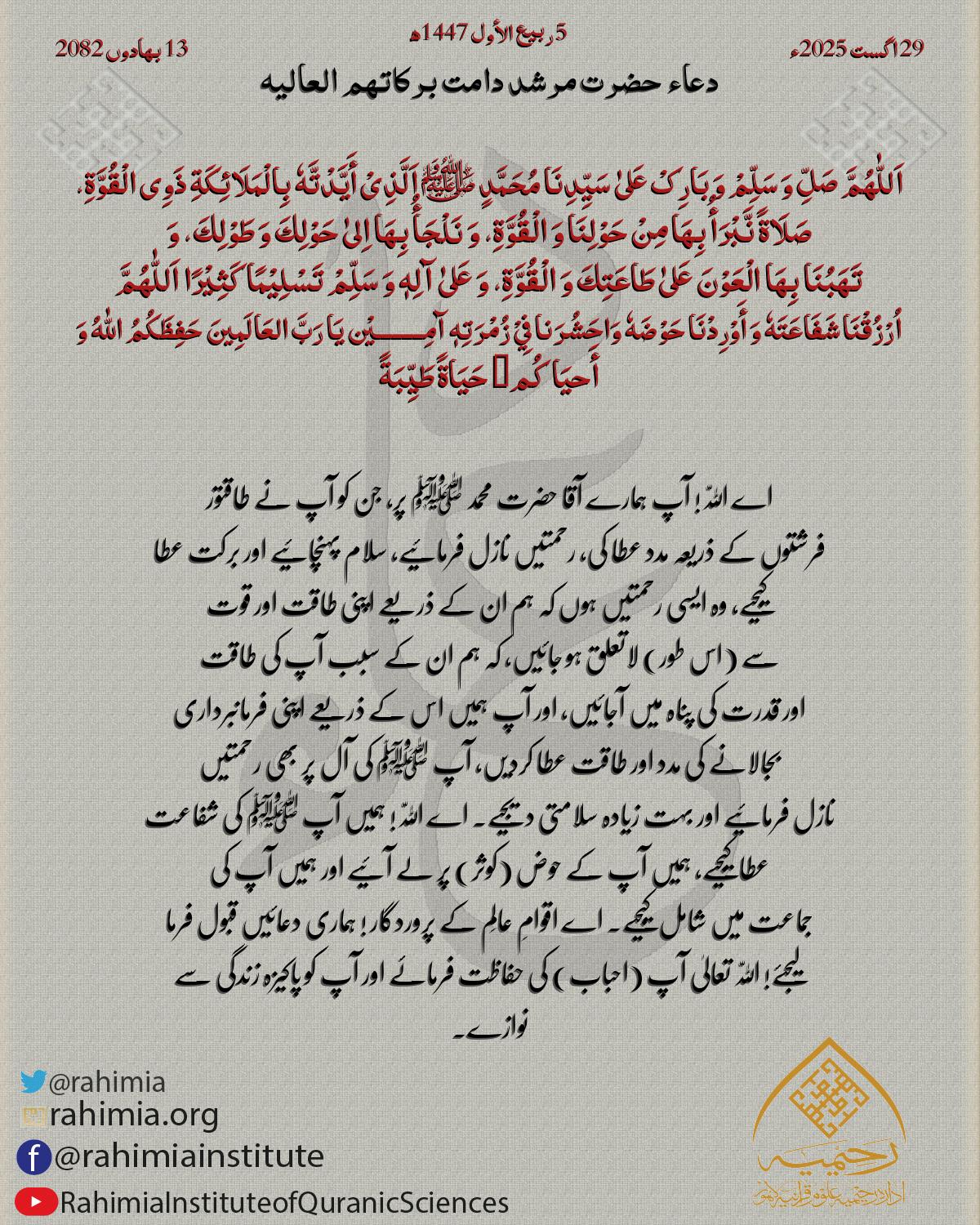 اَللّٰهُمَّ صَلِّ وَ سَلِّمْ وَ بَارِکْ عَلیٰ سَیِّدِنَا مُحَمَّدٍ ﷺ اَلَّذِیْ أَیَّدْتَّهٗ بِالْمَلَائِکَةِ ذَوِی الْقُوَّةِ، صَلَاةً نَّبْرَأُ بِھَا مِنْ حَوْلِنَا وَ الْقُوَّةِ، وَ نَلْجَأُ بِھَا اِلیٰ حَوْلِكَ وَ طَوْ…