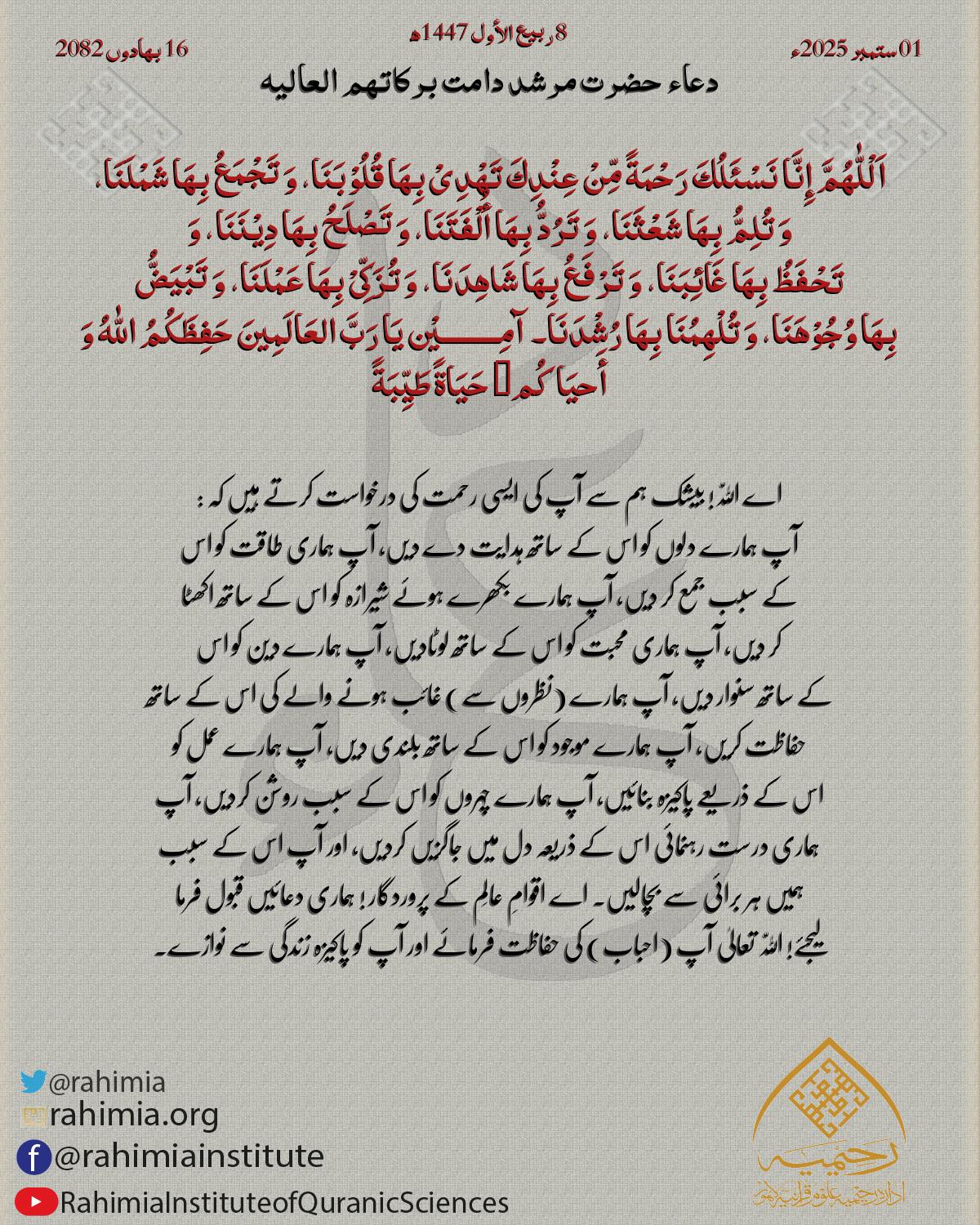 اَلْلّٰهُمَّ إِنَّا نَسْئَلُكَ رَحْمَةً مِّنْ عِنْدِكَ تَھْدِیْ بِھَا قُلُوْبَنَا، وَ تَجْمَعُ بِھَا شَمْلَنَا، وَ تُلِمُّ بِھَا شَعْثَنَا، وَ تَرُدُّ بِھَا أُلْفَتَنَا، وَ تَصْلَحُ بِھَا دِیْنَنَا، وَ تَحْ…