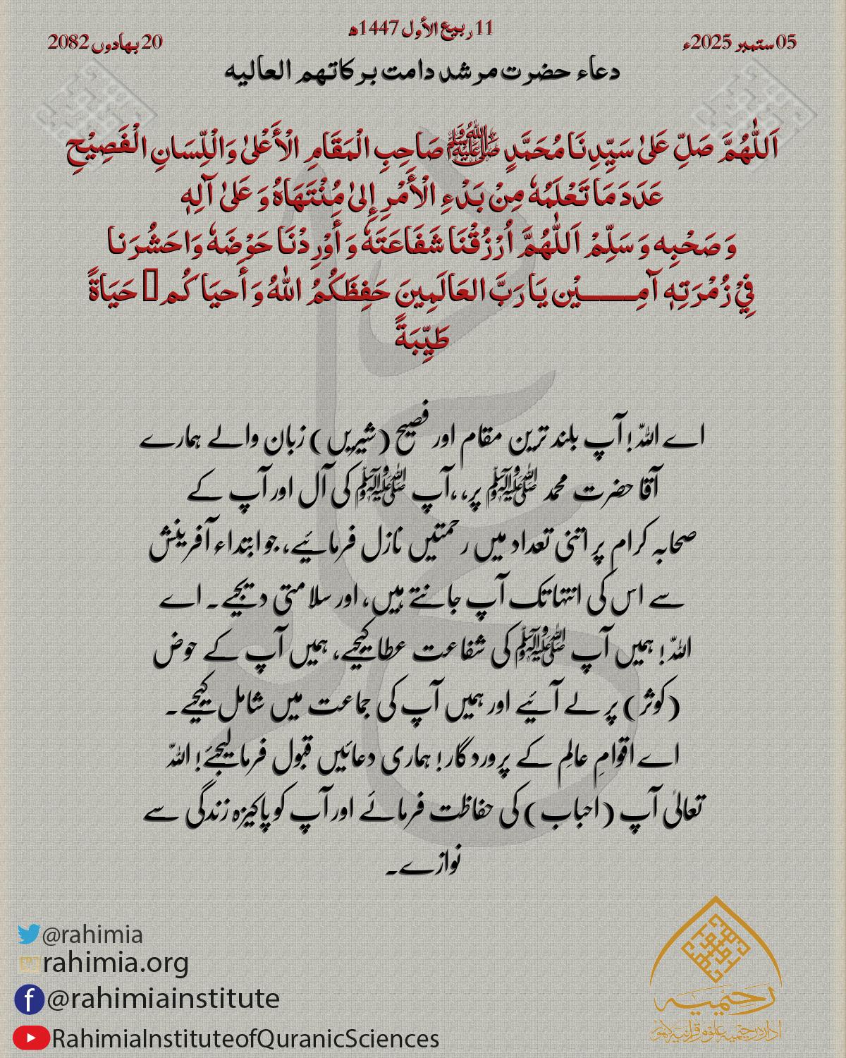اَللّٰهُمَّ صَلِّ عَلیٰ سَیِّدِنَا مُحَمَّدٍ ﷺ صَاحِبِ الْمَقَامِ الْأَعْلیٰ وَالْلِّسَانِ الْفَصِیْحِ عَدَدَ مَا تَعْلَمُهٗ مِنْ بَدْءِ الْأَمْرِ إِلیٰ مُنْتَھَاهُ وَ عَلیٰ آلِهٖ وَ صَحْبِه وَ سَلِّمْ اَللّٰهُ…