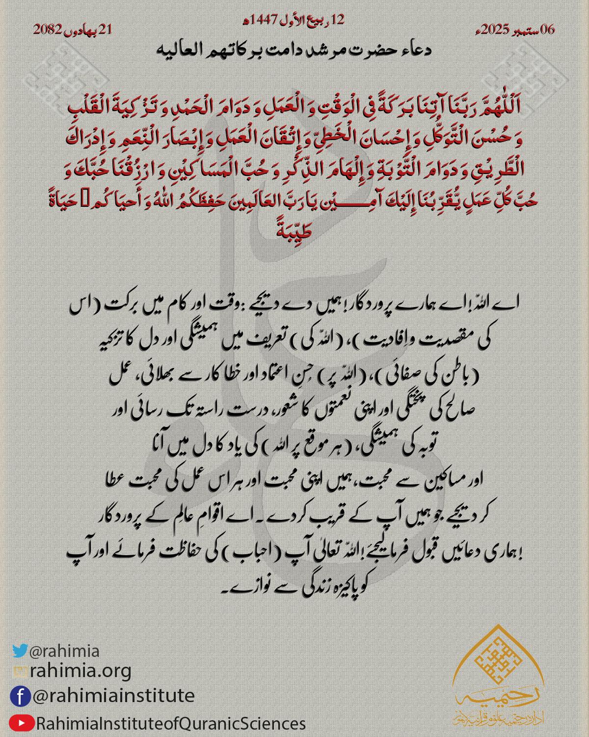 اَلْلّٰهُمَّ رَبَّنَا آتِنَا بَرَکَةً فِی الْوَقْتِ وَ الْعَمَلِ وَ دَوَامَ الْحَمْدِ وَ تَزْکِیَةَ الْقَلْبِ وَ حُسْنَ الْتَّوَکُّلِ وَ إِحْسَانَ الْخَطِیِّ وَ إِتْقَانَ الْعَمَلِ وَ إِبْصَارَ الْنِّعَمِ وَ إِدْرَاكَ…