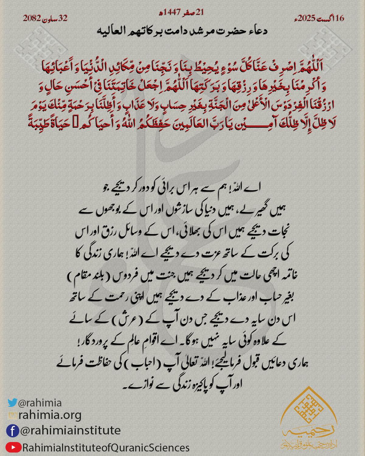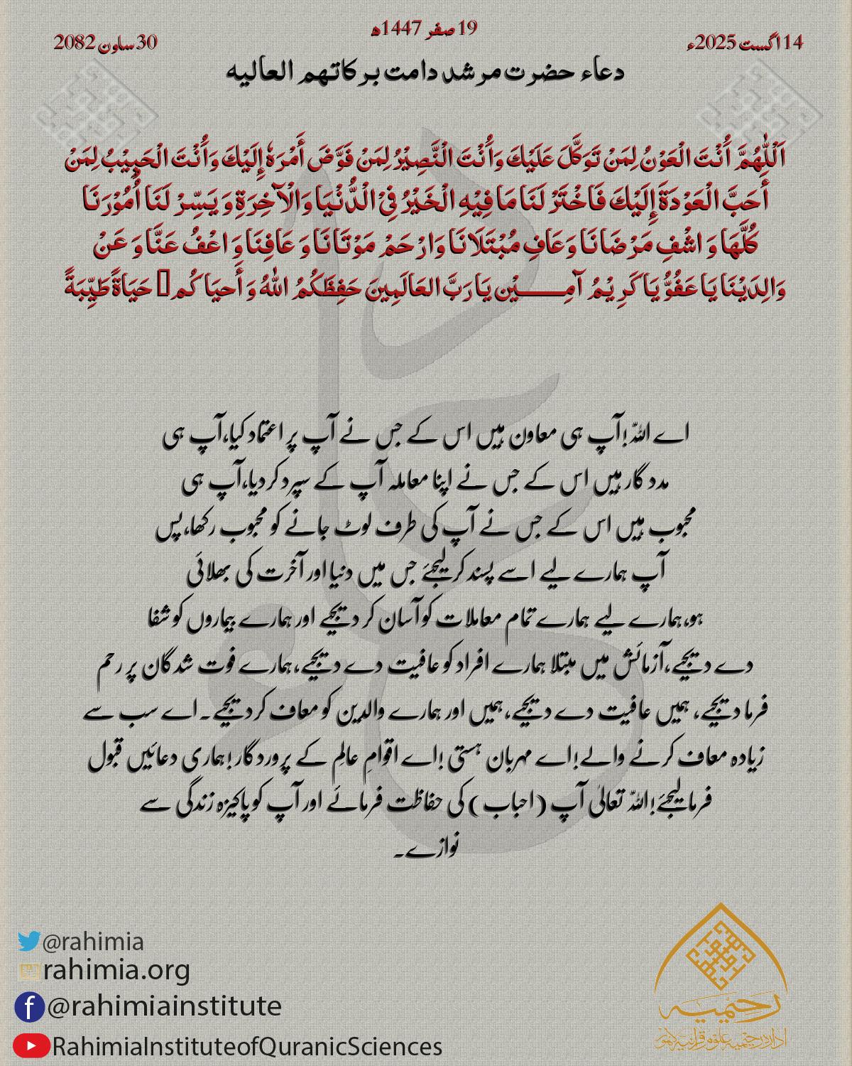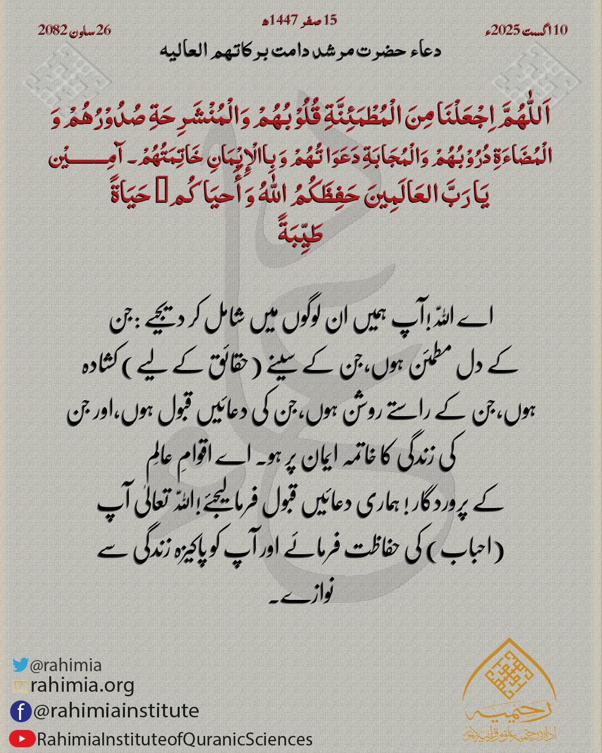اَللّٰهُمَّ اِجْعَلْنَا مِنَ الْمُطْمَئِنَّةِ قُلُوْبُھُمْ وَالْمُنْشَرِحَةِ صُدُوْرُھُمْ وَ الْمُضَاءَةِ دُرُوْبُھُمْ وَالْمُجَابَةِ دَعَوَاتُھُمْ وَ بِاالْإِیْمَانِ خَاتِمَتُھُمْ۔ آمِـــــــــيْن يَا رَبَّ ا…