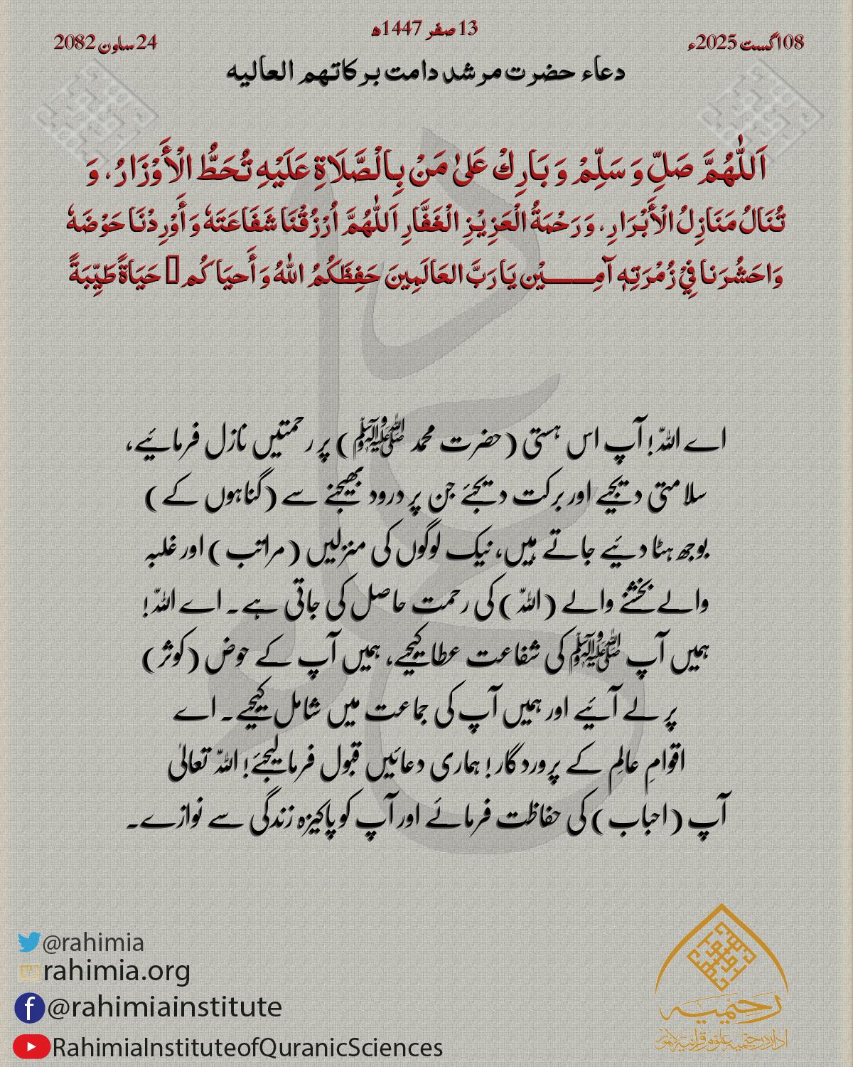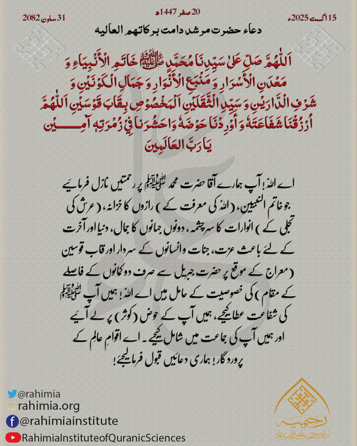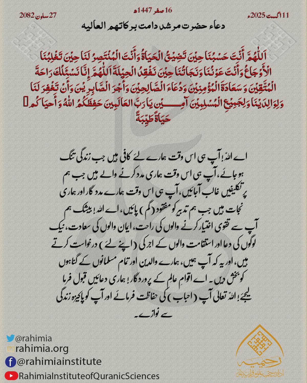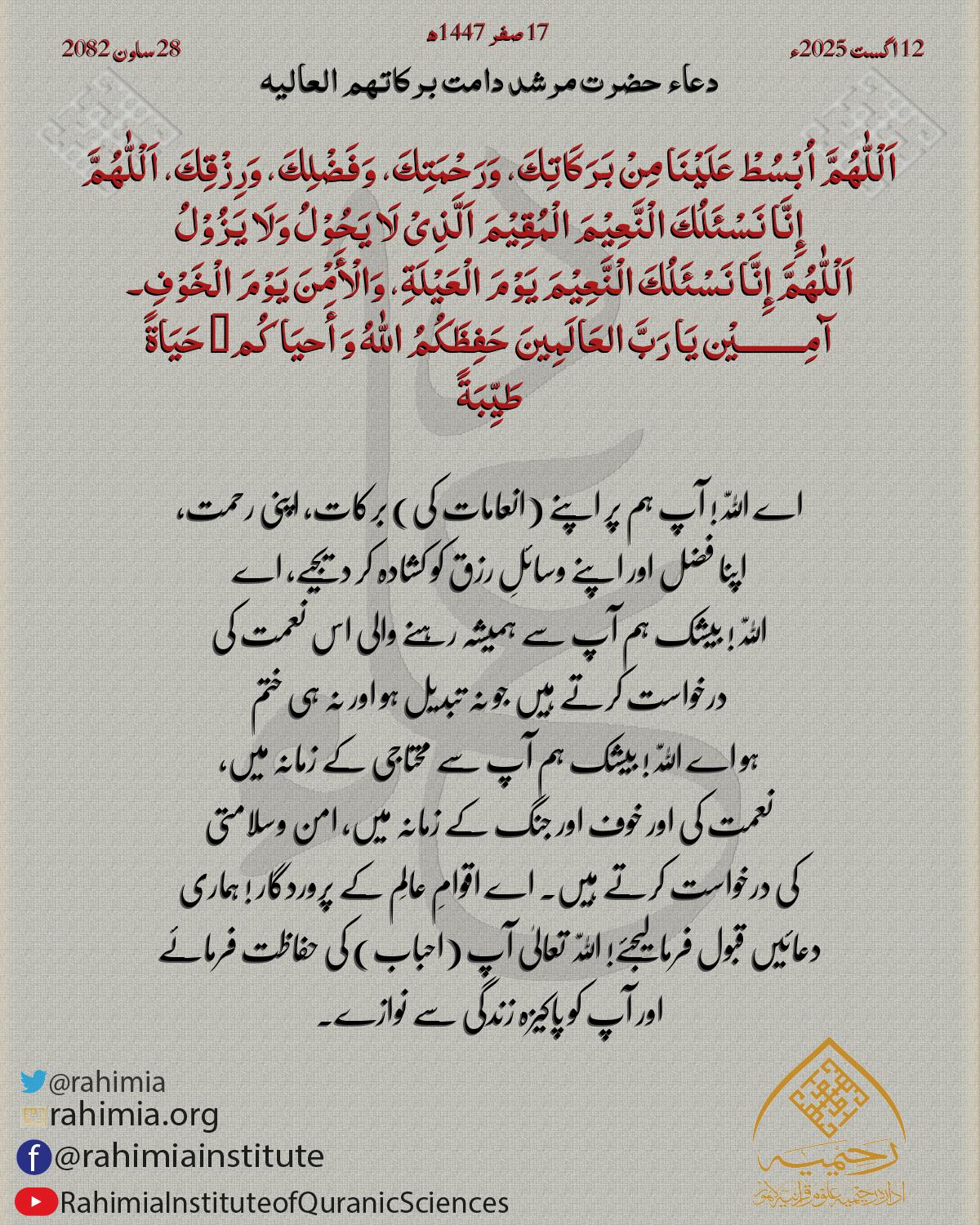 اَللّٰهُمَّ اِجْعَلْنَا مِنَ الْمُطْمَئِنَّةِ قُلُوْبُھُمْ وَالْمُنْشَرِحَةِ صُدُوْرُھُمْ وَ الْمُضَاءَةِ دُرُوْبُھُمْ وَالْمُجَابَةِ دَعَوَاتُھُمْ وَ بِاالْإِیْمَانِ خَاتِمَتُھُمْ۔ آمِـــــــــيْن يَا رَبَّ ا…