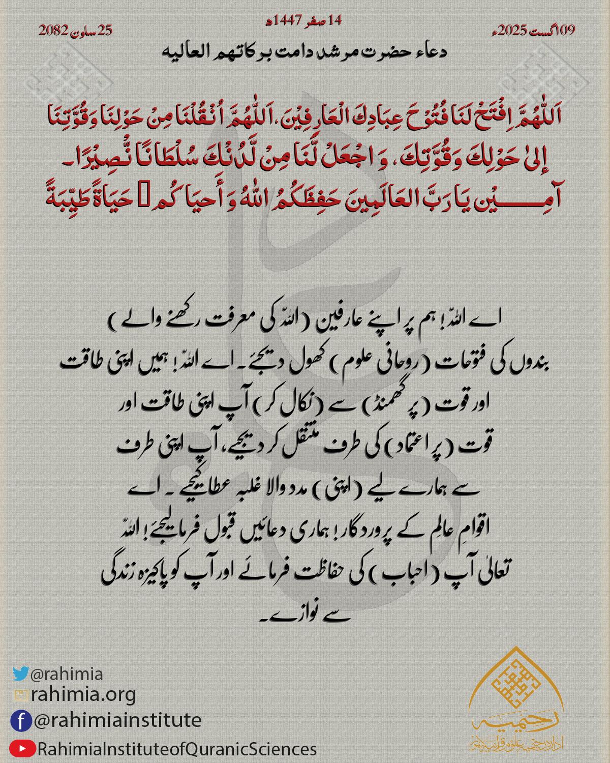 اَللّٰهُمَّ اِفْتَحْ لَنَا فُتُوْحَ عِبَادِكَ الْعَارِفِیْنَ،اَللّٰهُمَّ اُنْقُلْنَا مِنْ حَوْلِنَا وَقُوَّتِنَا إلیٰ حَوْلِكَ وَقُوَّتِكَ، وَ اجْعَلْ لَّنَا مِنْ لَّدُنْكَ سُلْطَانًا نّْصِیْرًا۔ آمِـــــــــيْن يَا…