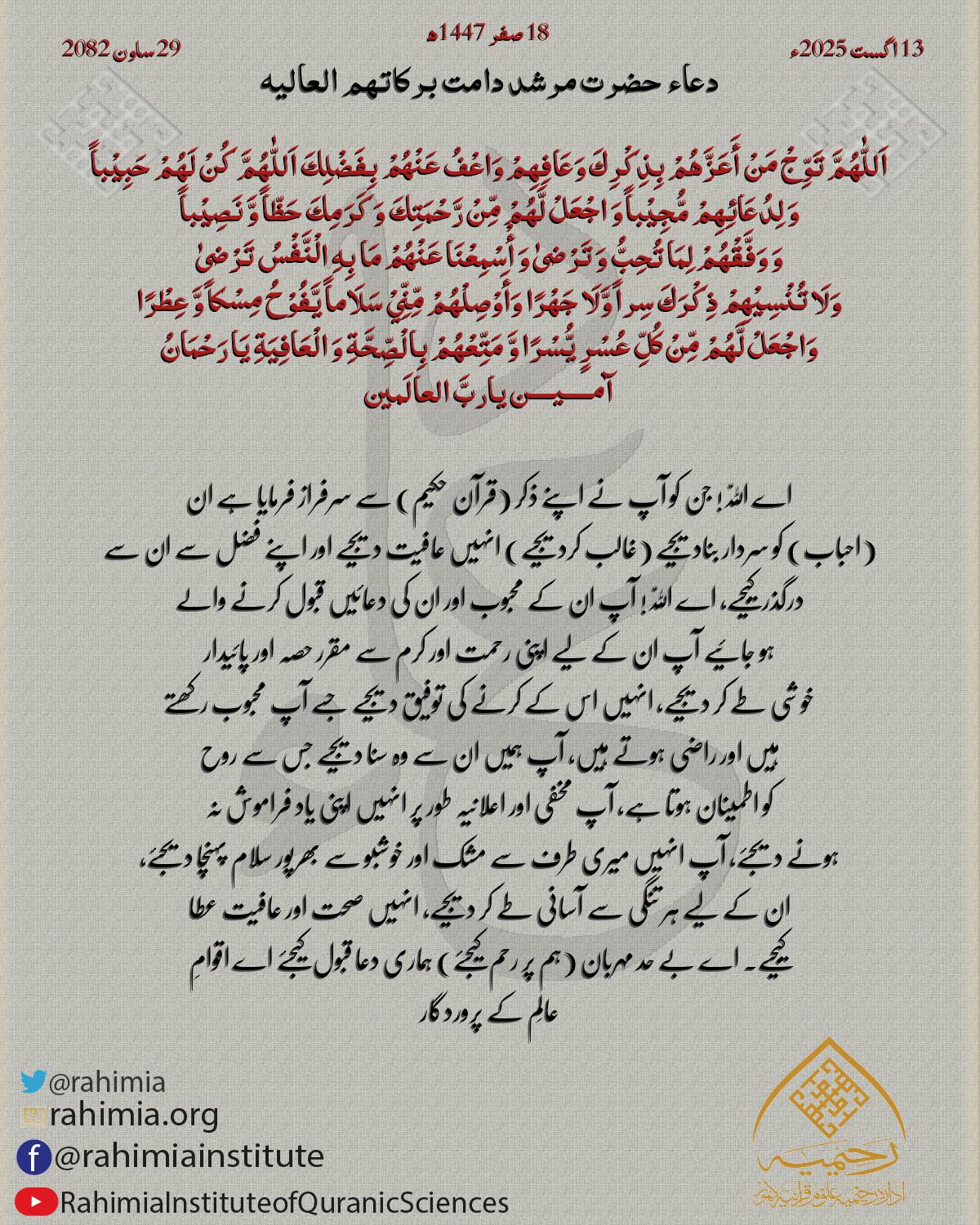 اَللّٰهُمَّ تَوِّجْ مَنْ أَعَزَّهُمْ بِذِكْرِكَ وَعَافِهِمْ وَاعْفُ عَنْهُمْ بِفَضْلِكَ اَللّٰهُمَّ كُنْ لَهُمْ حَبِيْباً وَ لِدُعَائِهِمْ مُّجِيْباً وَ اجْعَلْ لَّهُمْ مِّنْ رَّحْمَتِكَ وَ كَرَمِكَ حَظّاً وَّ نَصِيْباً وَ…