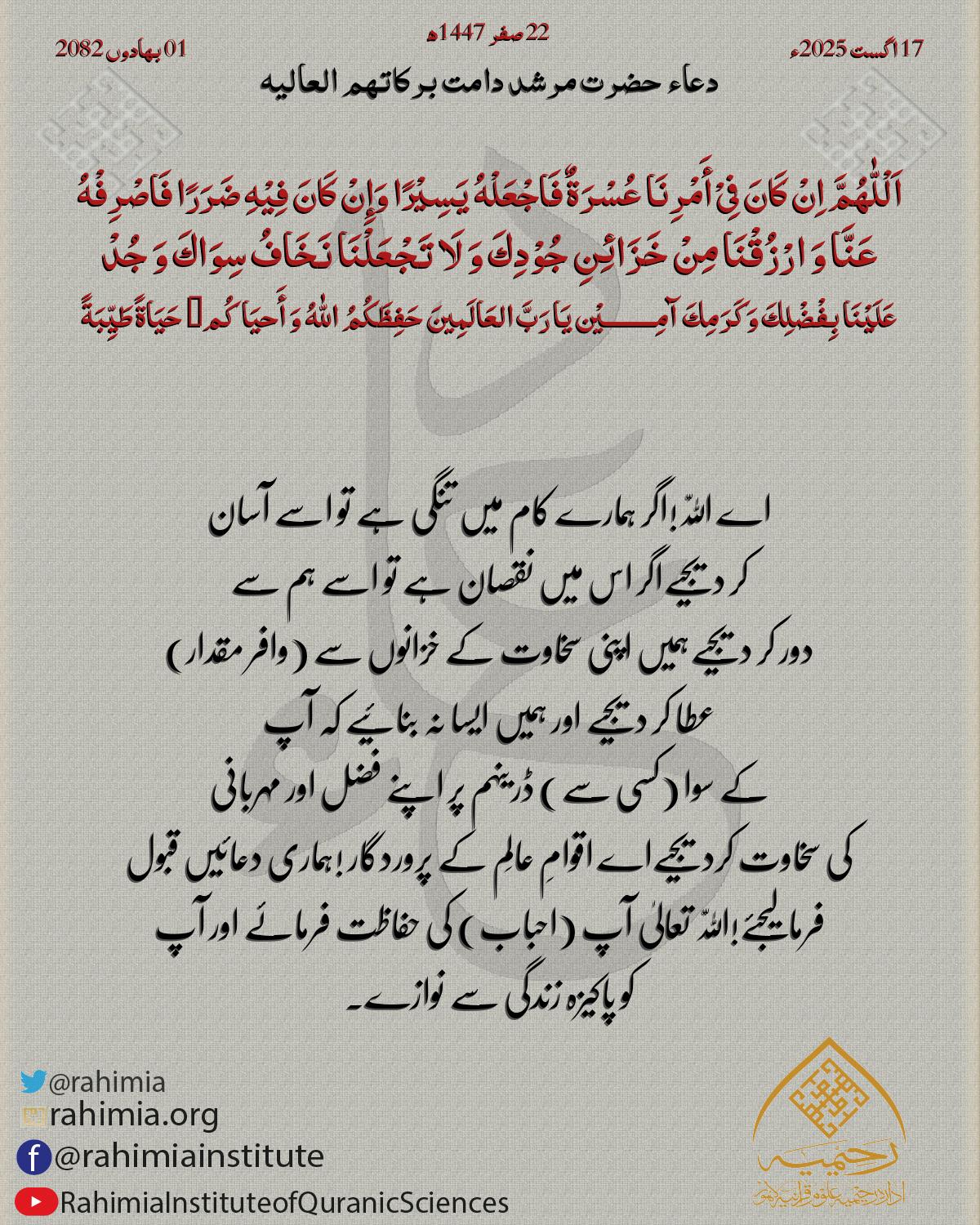 اَلْلّٰهُمَّ اِنْ کَانَ فِیْ أَمْرِنَا عُسْرَةٌ فَاجْعَلْهُ یَسِیْرًا وَإِنْ کَانَ فِیْهِ ضَرَرًا فَاصْرِفْهُ عَنَّا وَ ارْزُقْنَا مِنْ خَزَائِنِ جُوْدِكَ وَ لَا تَجْعَلْنَا نَخَافُ سِوَاكَ وَ جُدْ عَلَیْنَا بِ…