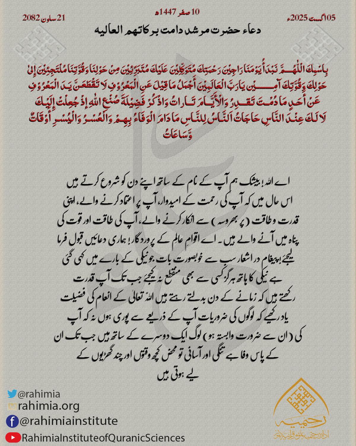 اَلْلّٰهُمَّ اِجْعَلْنَا مِنْ عِبَادِكَ الْمُتَّقِیْنَ أَسْعَدَکُمُ الْلّٰهُ بِلُطْفِهٖ وَ أَنَارَ طَرِیْقَکُمْ بِرَحْمَتِهٖ وَ اخْتَصَّکُمْ بِمَحَبَّتِهٖ وَ وَسَّعَ رِزْقَکُمْ بِتَوْفِیْقِهٖ وَ حَفِظَکُمُ الْمَوْلیٰ مِنْ…