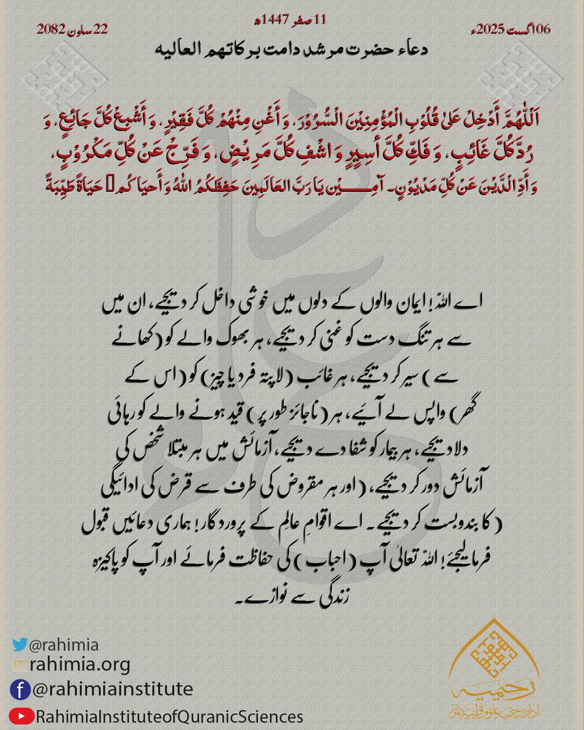 اَلْلّٰهُمَّ أَدْخِلْ عَلیٰ قُلُوْبِ الْمُؤْمِنِیْنَ الْسُّرُوْرَ، وَ أَغْنِ مِنْھُمْ کُلَّ فَقِیْرٍ، وَ أَشْبِعْ کُلَّ جَائِعٍ، وَ رُدَّ کُلَّ غَائِبٍ، وَ فَكِّ كُلَّ أسِيٍرٍ وَ اشْفِ کُلَّ مَرِیْضٍ، وَ فَرِّجْ …