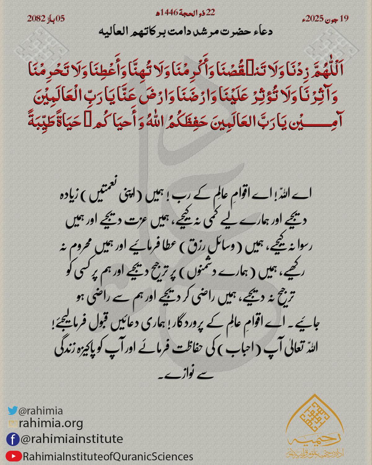 اَلْلّٰهُمَّ زِدْنَا وَلَا تَن٘قُصْنَا وَأَکْرِمْنَا وَلَا تُھِنَّا وَأَعْطِنَا وَلَا تَحْرِمْنَا وَآثِرْنَا وَلَا تُؤثِرْ عَلَیْنَا وَارْضَنَا وَارْضَ عَنَّا یَا رَبِّ الْعَالَمِیْنَ آمِـــــــــيْن يَ…