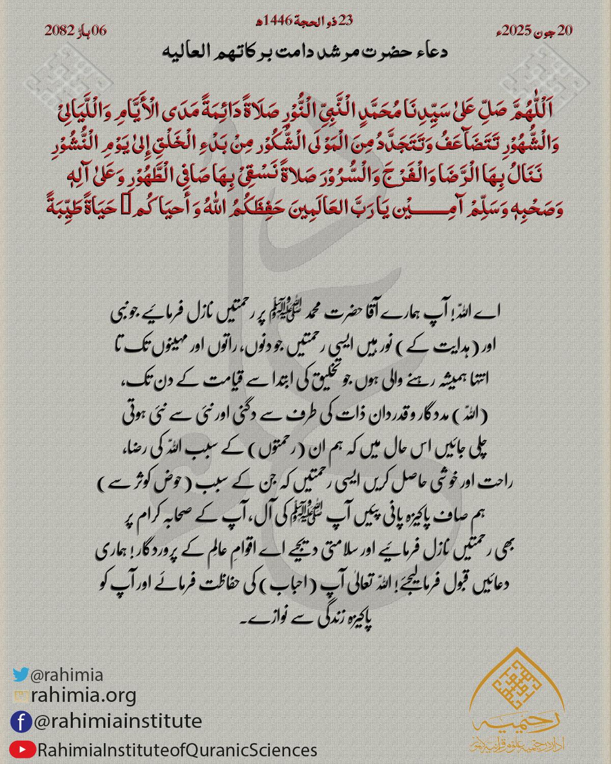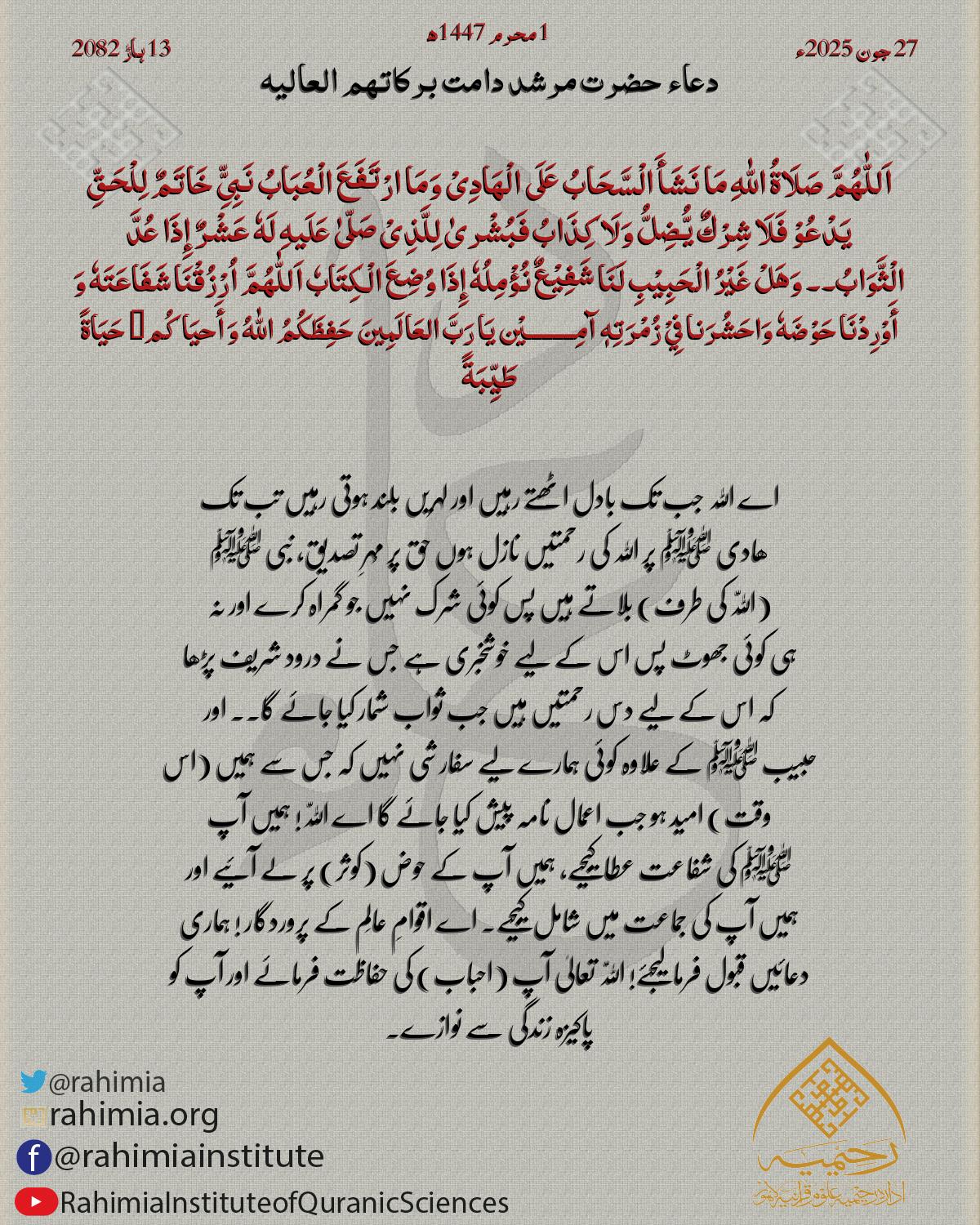 اَللّٰهُمَّ صَلَاةُ اللّٰهِ مَا نَشَأَ الْسَّحَابُ عَلَی الْھَادِیْ وَمَا ارْتَفَعَ الْعُبَابُ نَبِیِّّ خَاتَمٌ لِلْحَقِّ یَدْعُوْ فَلَا شِرْكٌ یُّضِلُّ وَلَا کِذَابُ فَبُشْریٰ لِلَّذِیْ صَلّیٰ عَلَیهِ لَهٗ…