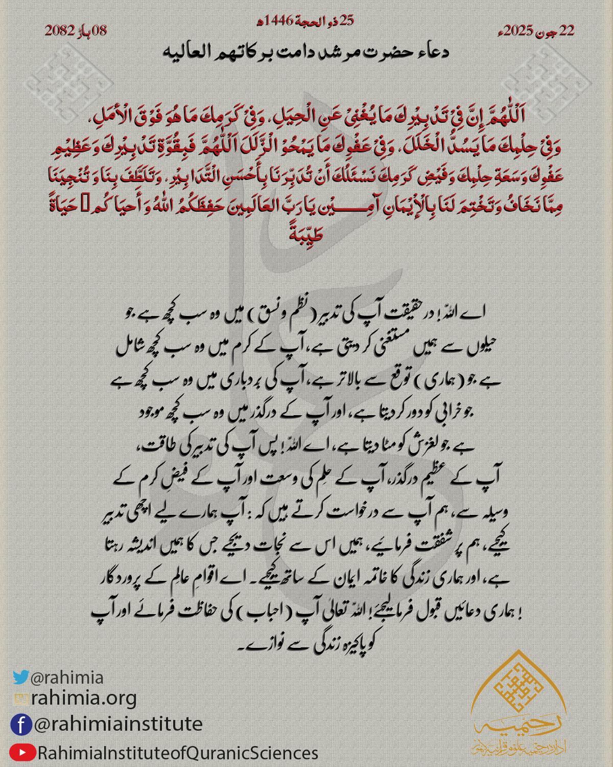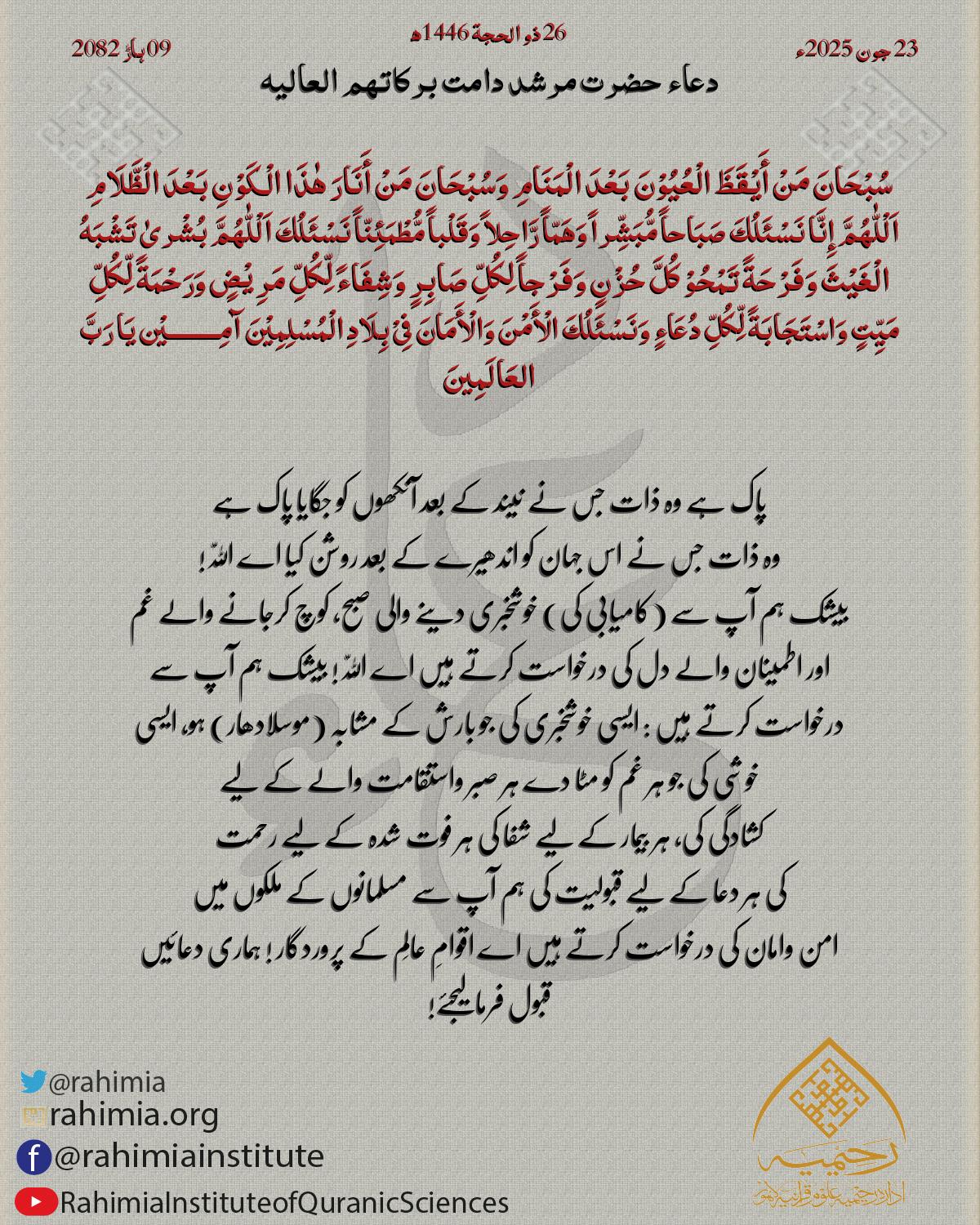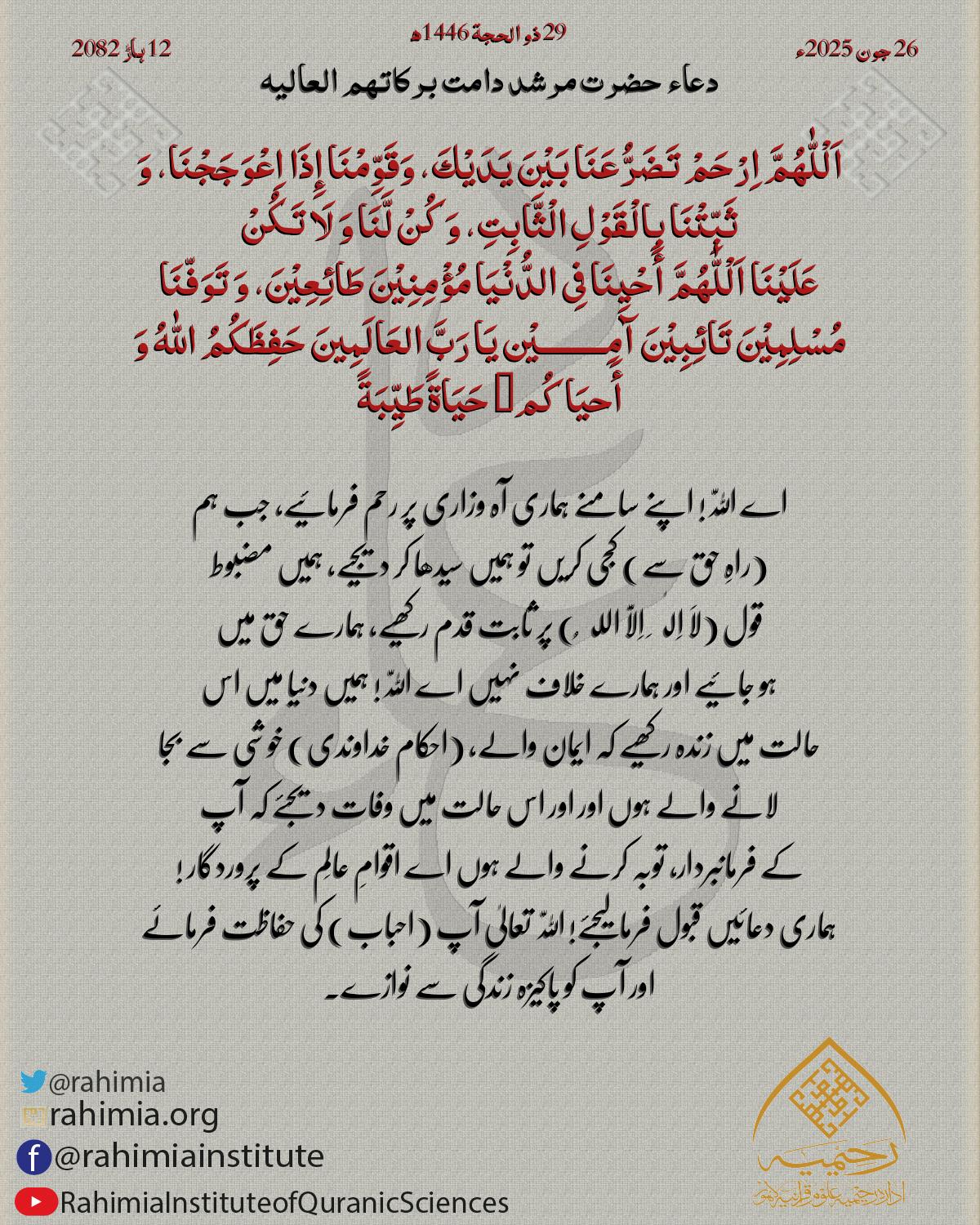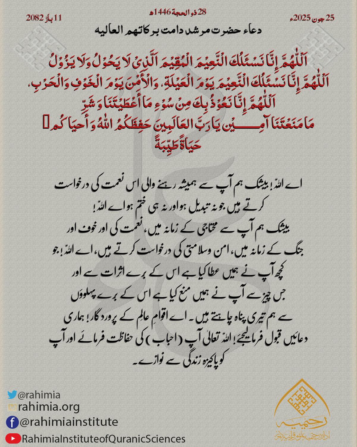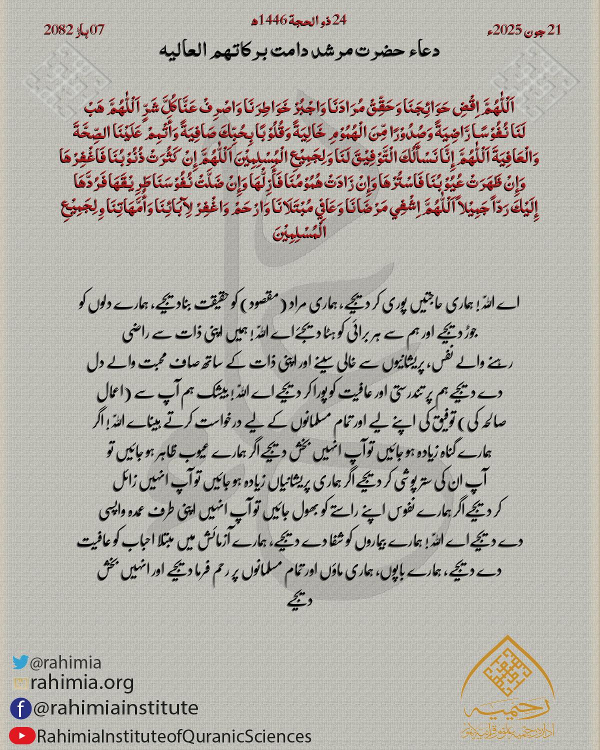 اَلْلّٰهُمَّ اِقْضِ حَوَائِجَنَا وَحَقِّقْ مُرَادَنَا وَاجْبُرْ خَوَاطِرَنَا وَاصْرِفْ عَنَّا كُلَّ شَرٍّ اَلْلّٰهُمَّ هَبْ لَنَا نُفُوْسًـا رَّاضِيَةً وَصُدُوْرًا مِّنَ الْهُمُوْمِ خَالِيَةً وَقُلُوْبًا بِحُبِّكَ صَافِيَةً…