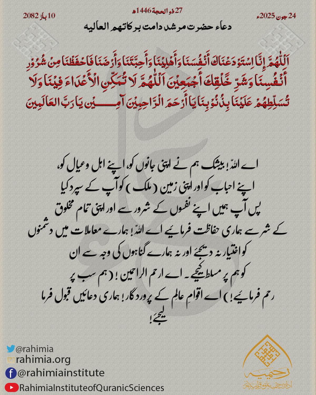 اَلْلّٰهُمَّ إِنَّا اِسْتَوْدَعْنَاكَ أَنْفُسَنَا وَأَھْلِیْنَا وَأَحِبَّتَنَا وَأَرْضَنَا فَاحْفَظْنَا مِنْ شُرُوْرِ أَنْفُسِنَا وَشَرِّ خََلْقِكَ أَجْمَعِیْنَ اَلْلّٰهُمَّ لَا تُمَکِّنِ الْأَعْدَاءَ فِیْنَا وَلَا تُسَلِّطِھُ…