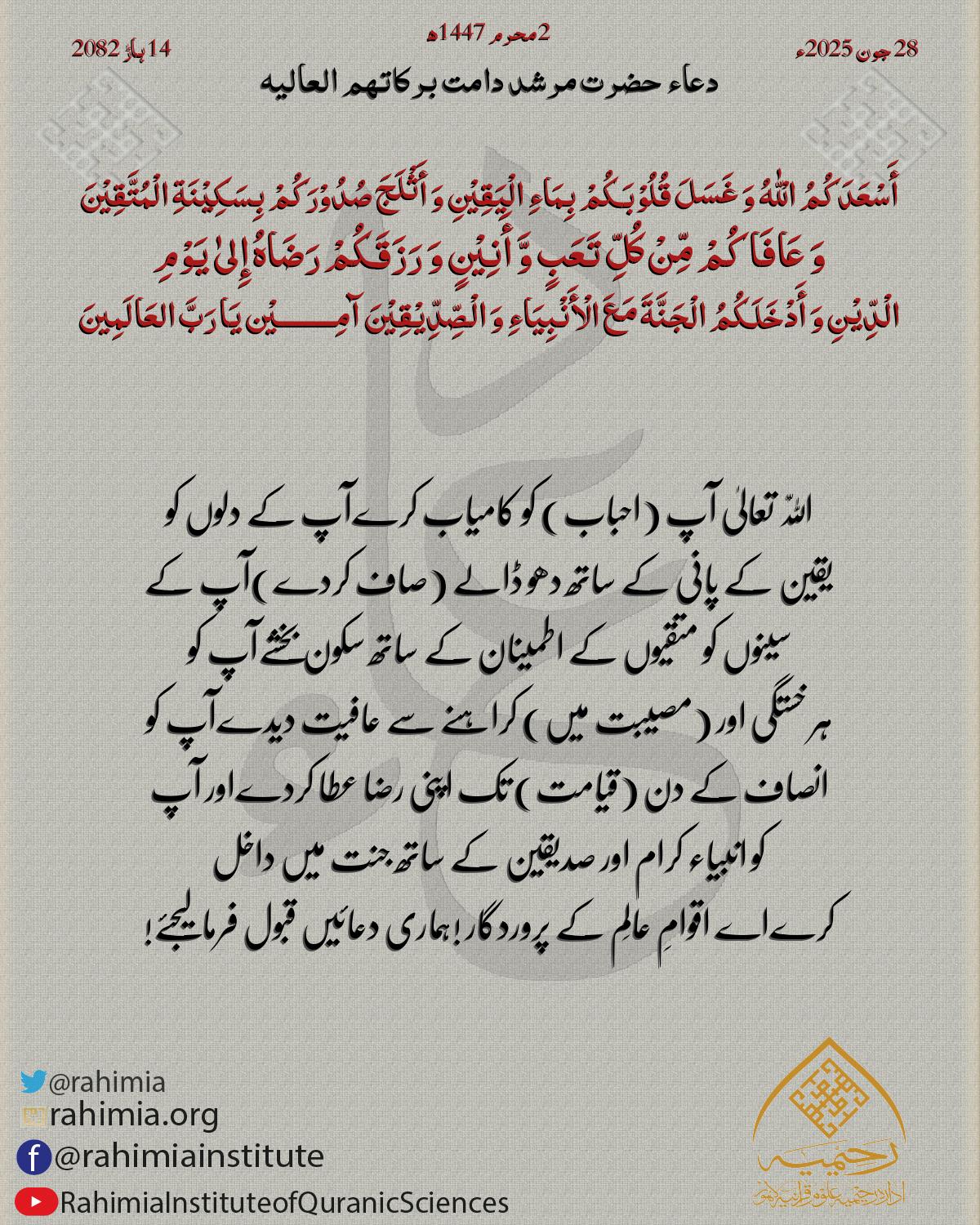 أَسْعَدَکُمُ الْلّٰهُ وَ غَسَلَ قُلُوْبَکُمْ بِمَاءِ الْیَقِیْنِ وَ أَثْلَجَ صُدُوْرَکُمْ بِسَکِیْنَةِ الْمُتَّقِیْنَ وَ عَافَاکُمْ مِّنْ کُلِّ تَعَبٍ وَّ أَنِیْنٍ وَ رَزَقَکُمْ رَضَاهُ إِلیٰ یَوْمِ الْدِّیْنِ وَ أَدْخَ…