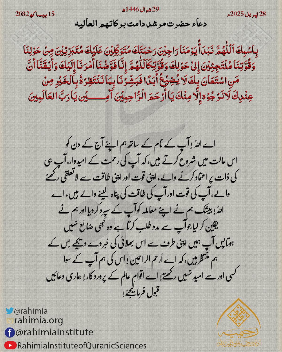 بِاسْمِكَ اَلْلّٰھُمَّ نَبْدَأُ یَوْمَنَا رَاجِیْنَ رَحْمَتَكَ مُتَوَکِّلِیْنَ عَلَیْكَ مُتَبَرِّئِیْنَ مِنْ حَوْلِنَا وَقُوَّتِنَا مُلْتَجِئِیْنَ إِلیٰ حَوْلِكَ وَقُوَّتِكَاَلْلّٰهُمَّ إِنَّا فَوَّضْنَا أَمْرَنَا إِلَیْكَ وَأَیْقَنَّ…