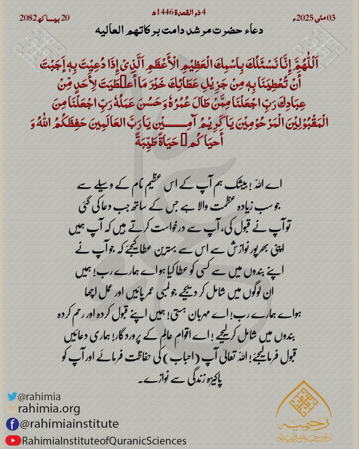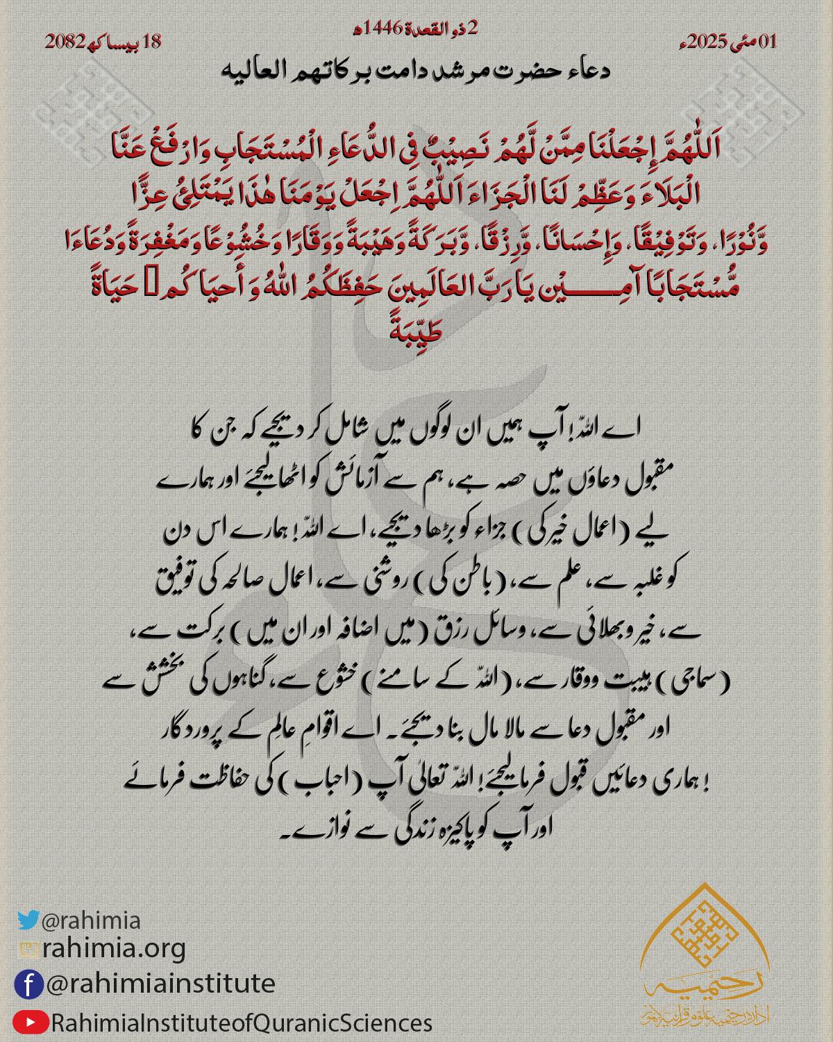 اَللّٰهُمَّ إِجْعَلْنَا مِمَّنْ لَّھُمْ نَصِیْبٌ فِی الدُّعَاءِ الْمُسْتَجَابِ وَارْفَعْ عَنَّا الْبَلَاءَ وَعَظِّمْ لَنَا الْجَزَاءَ اَللّٰهُمَّ اِجْعَلْ یَوْمَنَا ھٰذَا یَمْتَلِئُ عِزًّا وَّنُوْرًا، وَتَوْفِیْقًا، وَإِحْ…