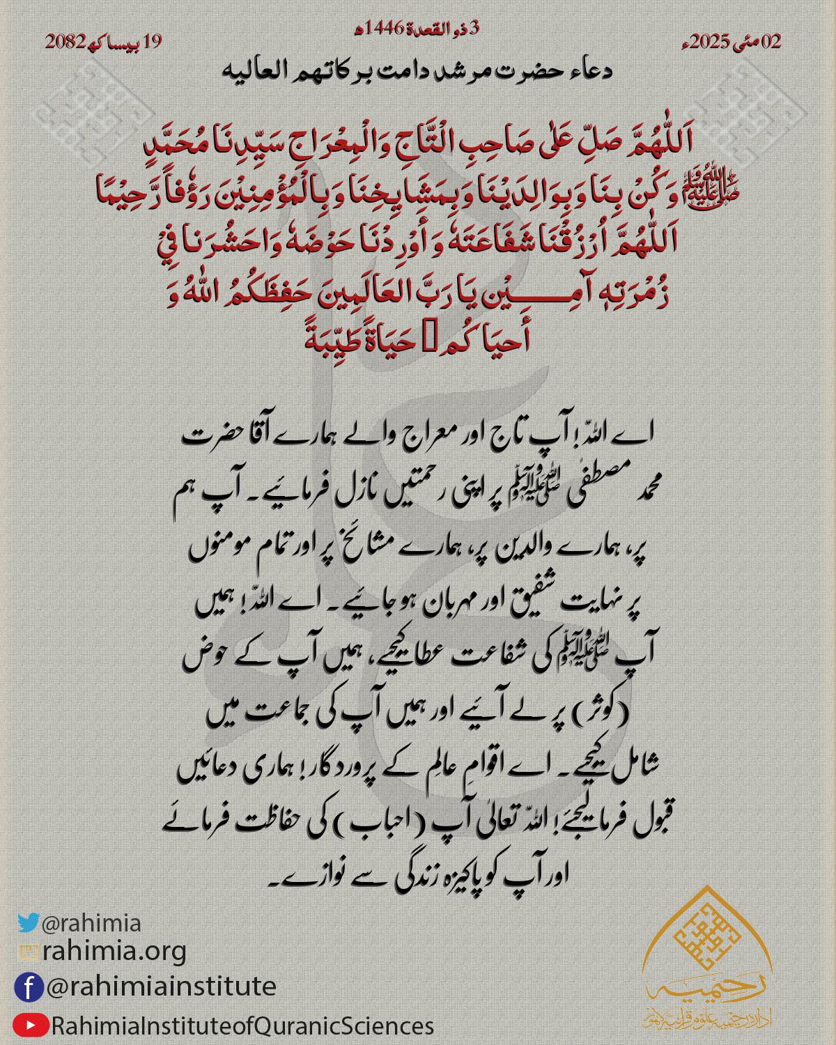 اَللّٰهُمَّ صَلِّ عَلٰی صَاحِبِ الْتَّاجِ وَالْمِعْرَاجِ سَیِّدِنَا مُحَمَّدٍ ﷺ وَکُنْ بِنَا وَبِوَالِدَیْنَا وَبِمَشَایِخِنَا وَبِالْمُؤْمِنِیْنَ رَؤٗفاً رَّحِیْمًا اَللّٰهُمَّ اُرْزُقْنَا شَفَاعَتَهٗ وَ أَوْرِدْنَ…