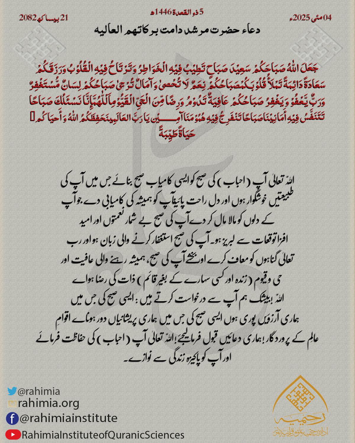 جَعَلَ اللّٰهُ صَبَاحَکُمْ سَعِیْدَ صَبَاحٍ تَطِیْبُ فِیْهِ الْخَوَاطِرُ وَتَرْتَاحُ فِیْهِ الْقُلُوْبُ وَرَزَقَکُمْ سَعَادَةً دَائِمَةً تَمْلَأُ قُلُوْبَکُمْصَبَاحُکُمْ نِعَمٌ لَا تُحْصیٰ وَآمَالٌ تُرْجیٰ صَبَاحُکُمْ لِ…