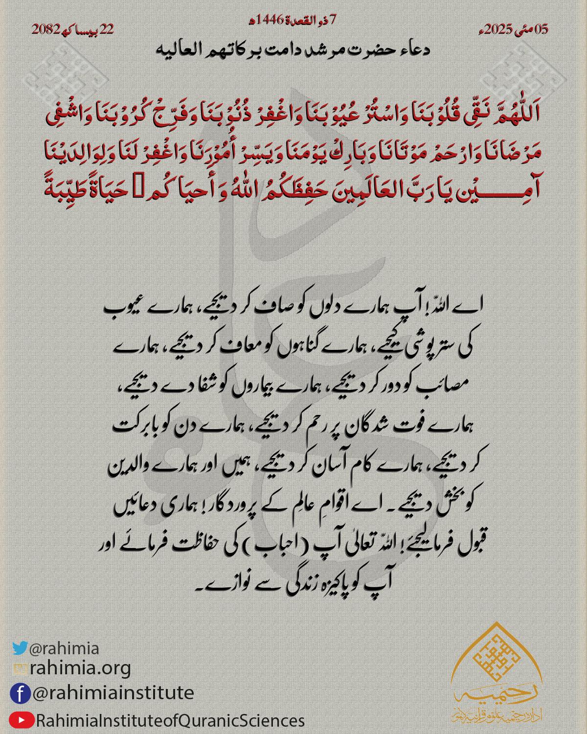اَللّٰهُمَّ نَقِّی قُلُوْبَنَا وَاسْتُرْ عُیُوْبَنَا وَاغْفِرْ ذُنُوْبَنَا وَفَرِّجْ کُرُوْبَنَا وَاشْفِی مَرْضَانَا وَارْحَمْ مَوْتَانَا وَبَارِكْ یَوْمَنَا وَیَسِّرْ أُمُوْرَنَا وَاغْفِرْ لَنَا وَلِوَالِدَیْنَا …