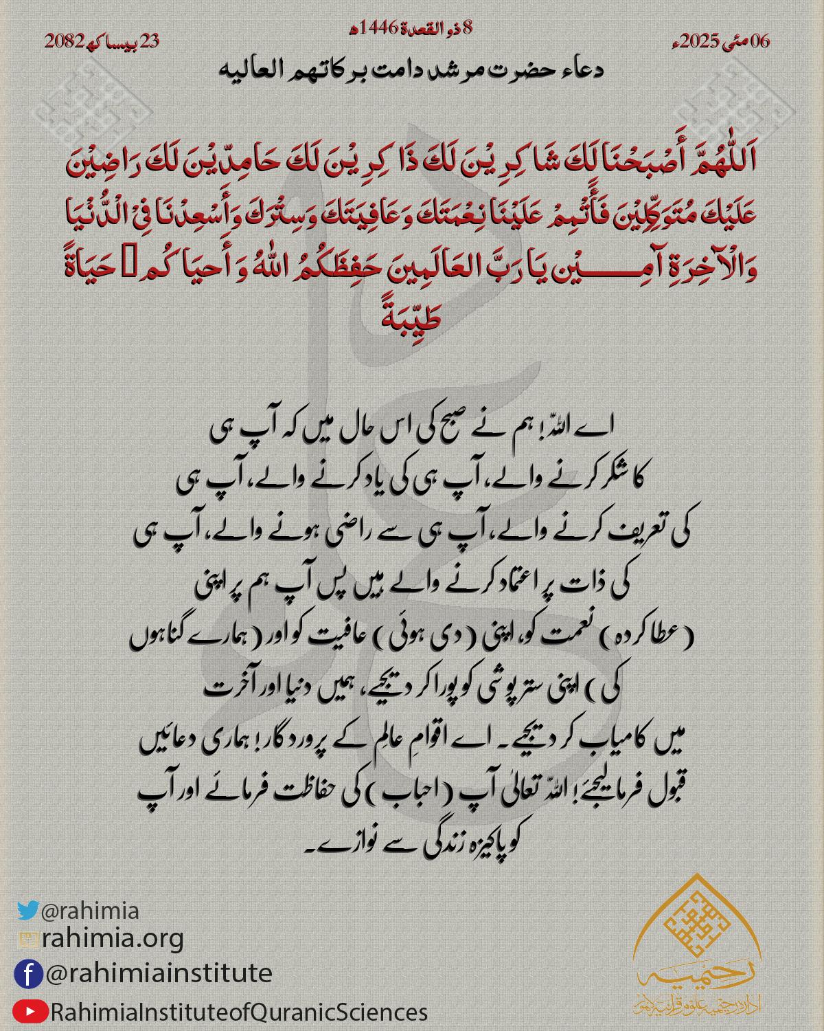 اَللّٰهُمَّ أَصْبَحْنَا لَكَ شَاکِرِیْنَ لَكَ ذَاکِرِیْنَ لَكَ حَامِدّيْنَ لَكَ رَاضِیْنَ عَلَیْكَ مُتَوَکِِّلِیْنَ فَأََتْمِمْ عَلَیْنَا نِعْمَتَكَ وَعَافِیَتَكَ وَسِتْرَكَ وَأَسْعِدْنَا فِیْ الْدُّنْیَا وَالْآخِرَةِ آ…