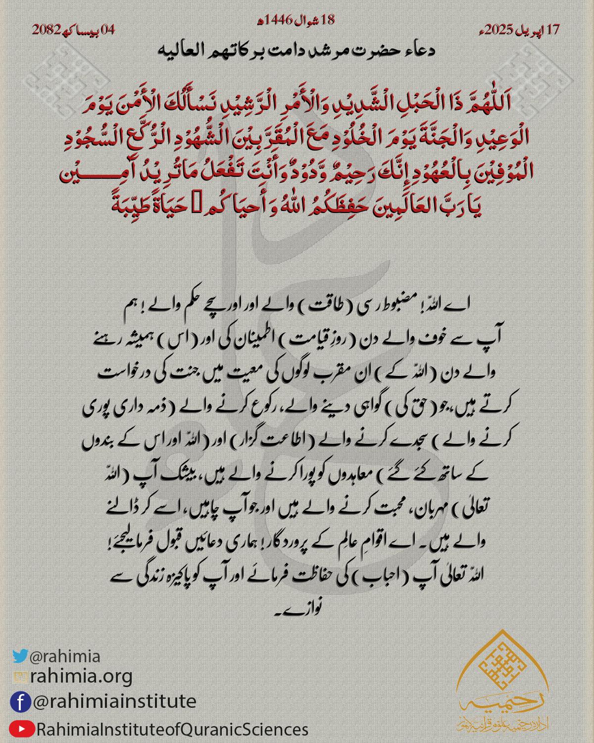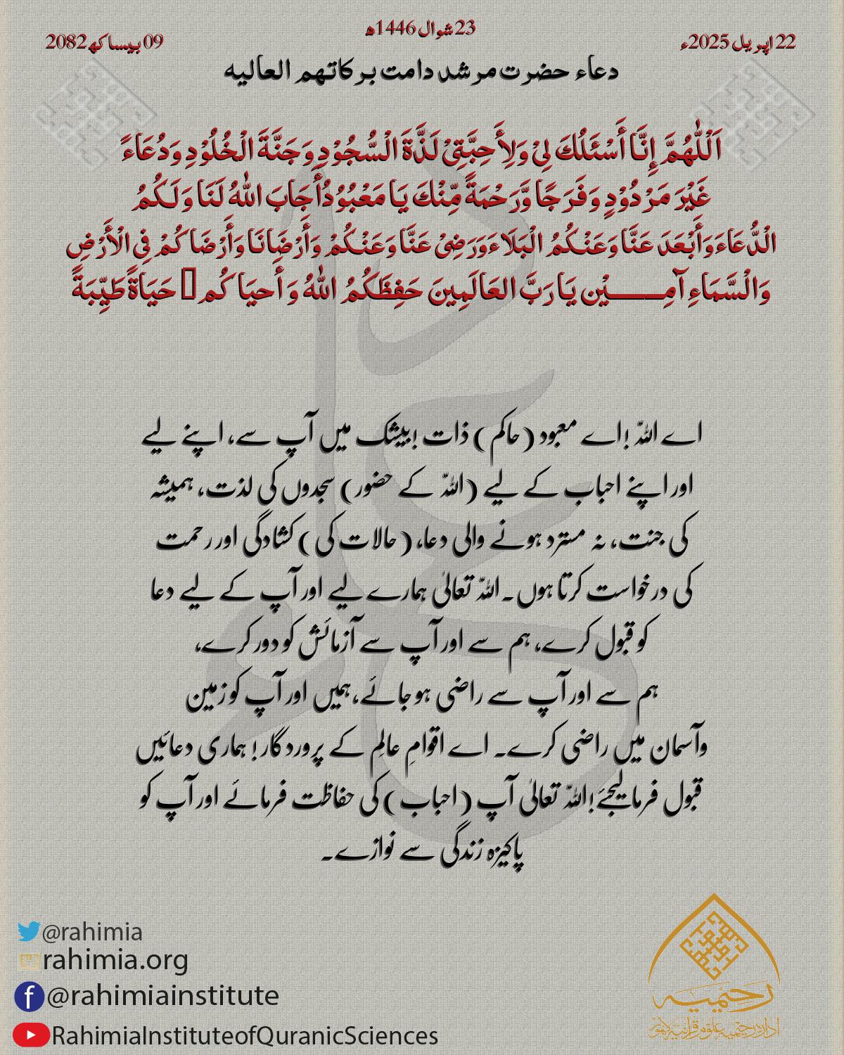اَلْلّٰهُمَّ إِنَّا أَسْئَلُكَ لِیْ وَلِأَحِبَّتِیْ لَذَّةَ الْسُّجُوْدِ وَجَنَّةَ الْخُلُوْدِ وَدُعَاءً غَیْرَ مَرْدُوْدٍ وَفَرَجًا وَّرَحْمَةً مِّنْكَ یَا مَعْبُوُدُأَجَابَ اللّٰهُ لَنَا وَلَکُمُ الْدُّعَاءَوَأَبْعَدَ عَنَّا وَعَنْکُ…
