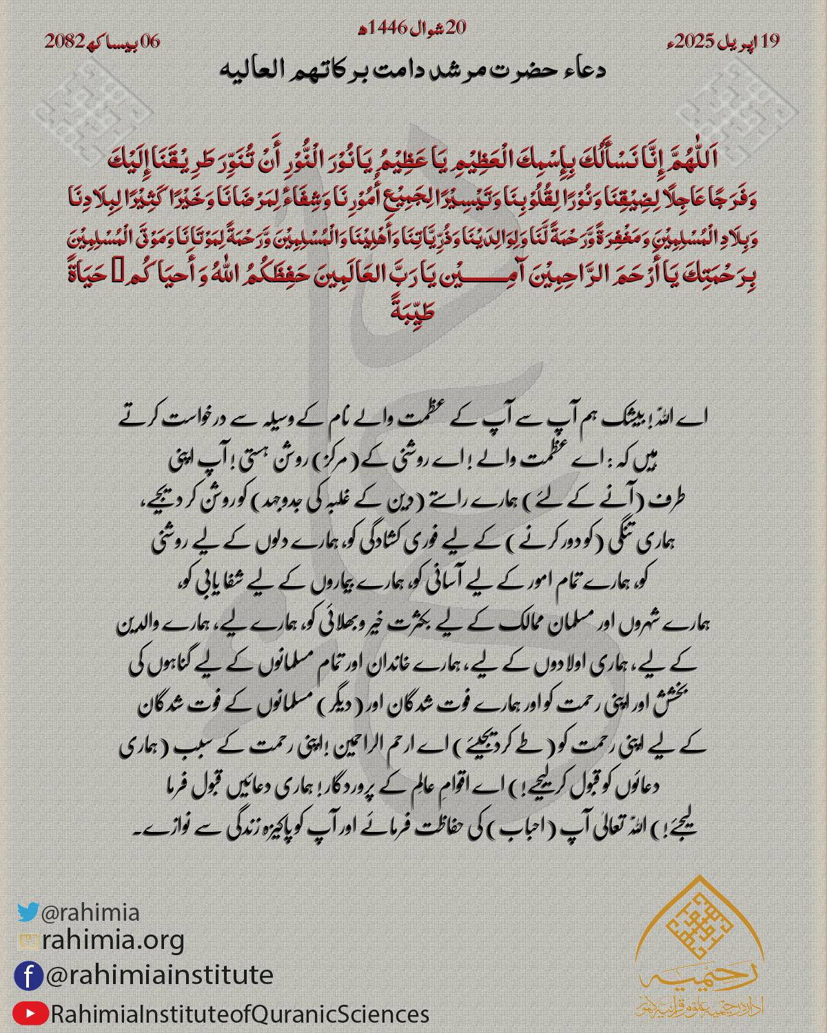 اَللّٰهُمَّ إِنَّا نَسْأَلُكَ بِإِسْمِكَ الْعَظِیْمِ یَا عَظِیْمُ یَانُوْرَ الْنُّوْرِ أَنْ تُنَوِّرَ طَرِیْقَنَا إِلَیْكَ وَفَرَجًا عَاجِلًا لِضِیْقِنَا وَنُوْرًا لِقُلُوْبِنَا وَتَیْسِیْرًا لِجَمِیْعِ أُمُوْرِنَا وَشِفَاءٔ …