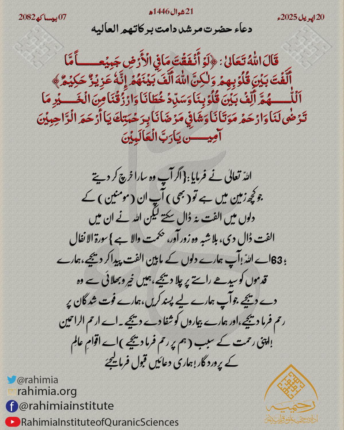 قَالَ اللّٰهُ تَعَالىٰ : ﴿لَوْ أَنْفَقْتَ مَافِي الْأَرْضِ جَمِيْعـــــــــاً مَّا أَلَّفْتَ بَيْنَ قُلُوْبِهِمْ وَلٰكِنَّ اللّٰهَ أَلَّفَ بَيْنَهُمْ إِنَّهٗ عَزِيْزٌ حَكِيْمٌ﴾ اَلْلّٰــــــــهُمَّ أَلِّ…