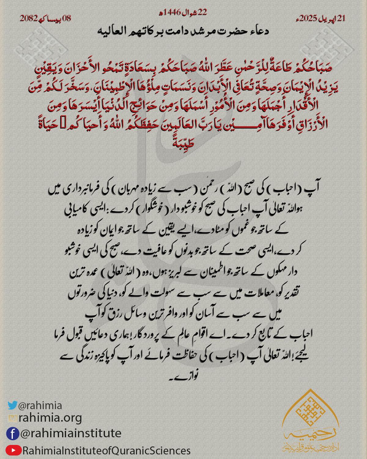 صَبَاحُکُمْ طَاعَةٌ لِلْرَّحْمٰنِ عَطَّرَ اللّٰهُ صَبَاحَکُمْ بِسَعَادَةٍ تَمْحُو الأَحْزَانَ وَیَقِیْنٍ یَزِیْدُ الْإِیْمَانَ وَصِحَّةٍ تُعَافِی الْأَبْدَانَ وَنَسَمَاتٍ مِلْؤُھَا الْإِطْمِیْنَانَ،وَسَخَّرَ لَکُمْ مِّنَ ا…