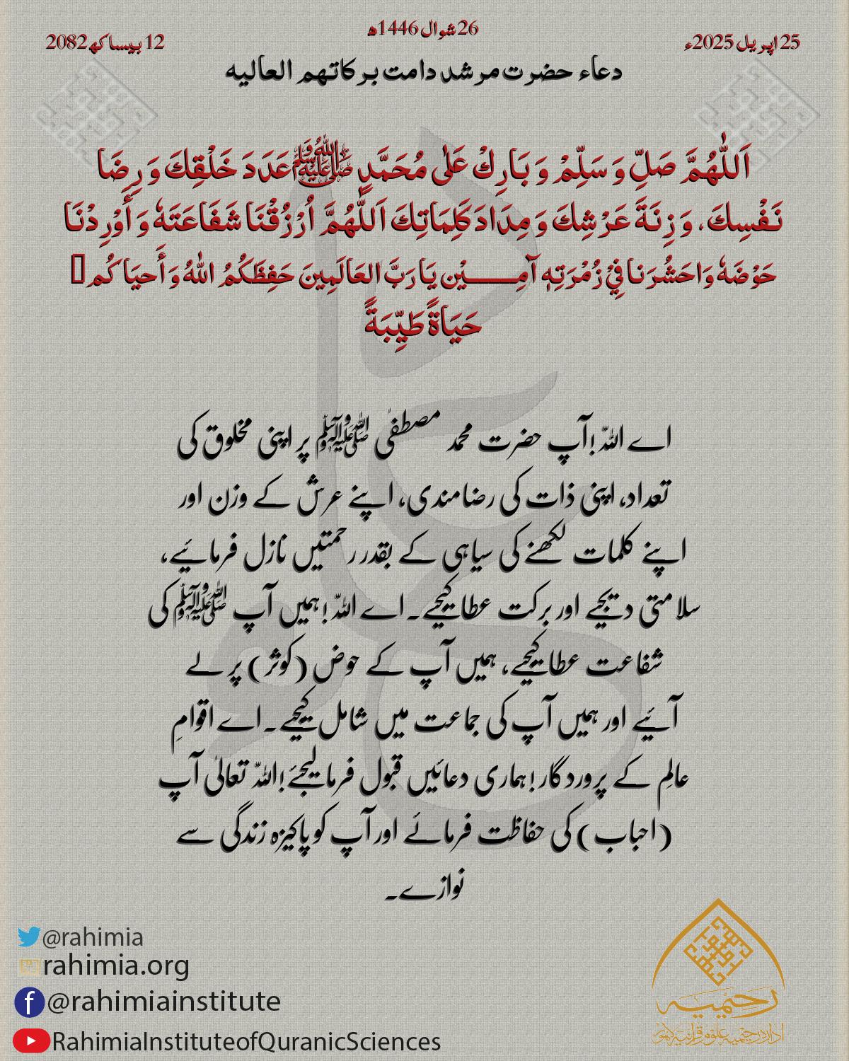 اَللّٰهُمَّ صَلِّ وَ سَلِّمْ وَ بَارِكْ عَلٰی مُحَمَّدٍ ﷺعَدَدَ خَلْقِكَ وَ رِضَا نَفْسِكَ، وَ زِنَةَ عَرْشِكَ وَ مِدَادَ کَلِمَاتِكَ اَللّٰهُمَّ اُرْزُقْنَا شَفَاعَتَهٗ وَ أَوْرِدْنَا حَوْضَهٗ وَاحَشُرَنا فِيْ زُمْرَتِ…