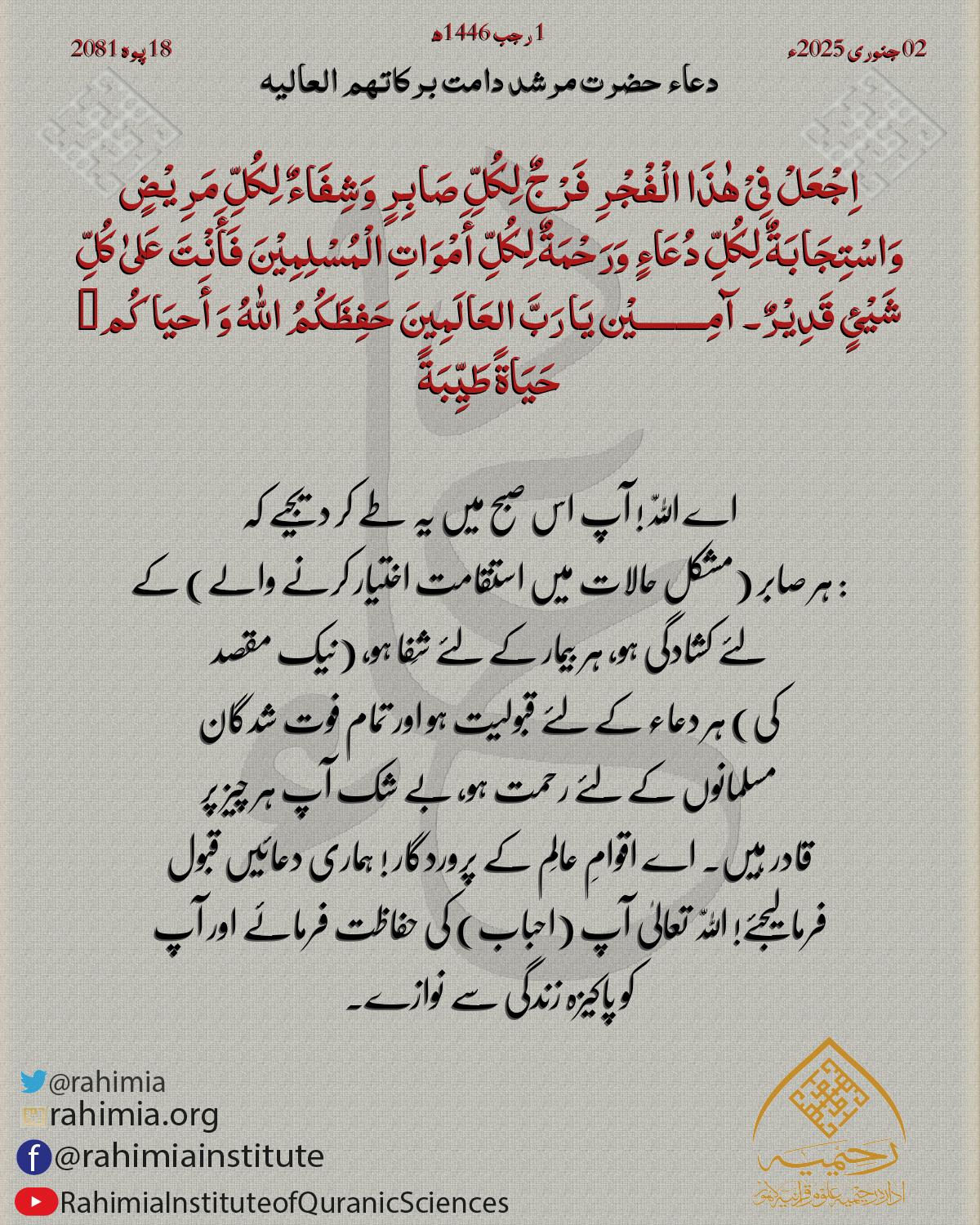 اِجْعَلْ فِیْ ھٰذَا الْفْجْرِ فَرْجٌ لِکُلِّ صَابِرٍ وَشِفَاءٌ لِکُلِّ مَرِیْضٍ وَاسْتِجَابَةٌ لِکُلِّ دُعَاءٍ وَرَحْمَةٌ لِکُلِّ أَمْوَاتِ الْمُسْلِمِیْنَ فَأَنْتَ عَلیٰ کُلِّ شَیْئٍ قَدِیْرٌ۔ آمِـــــــــيْن …
