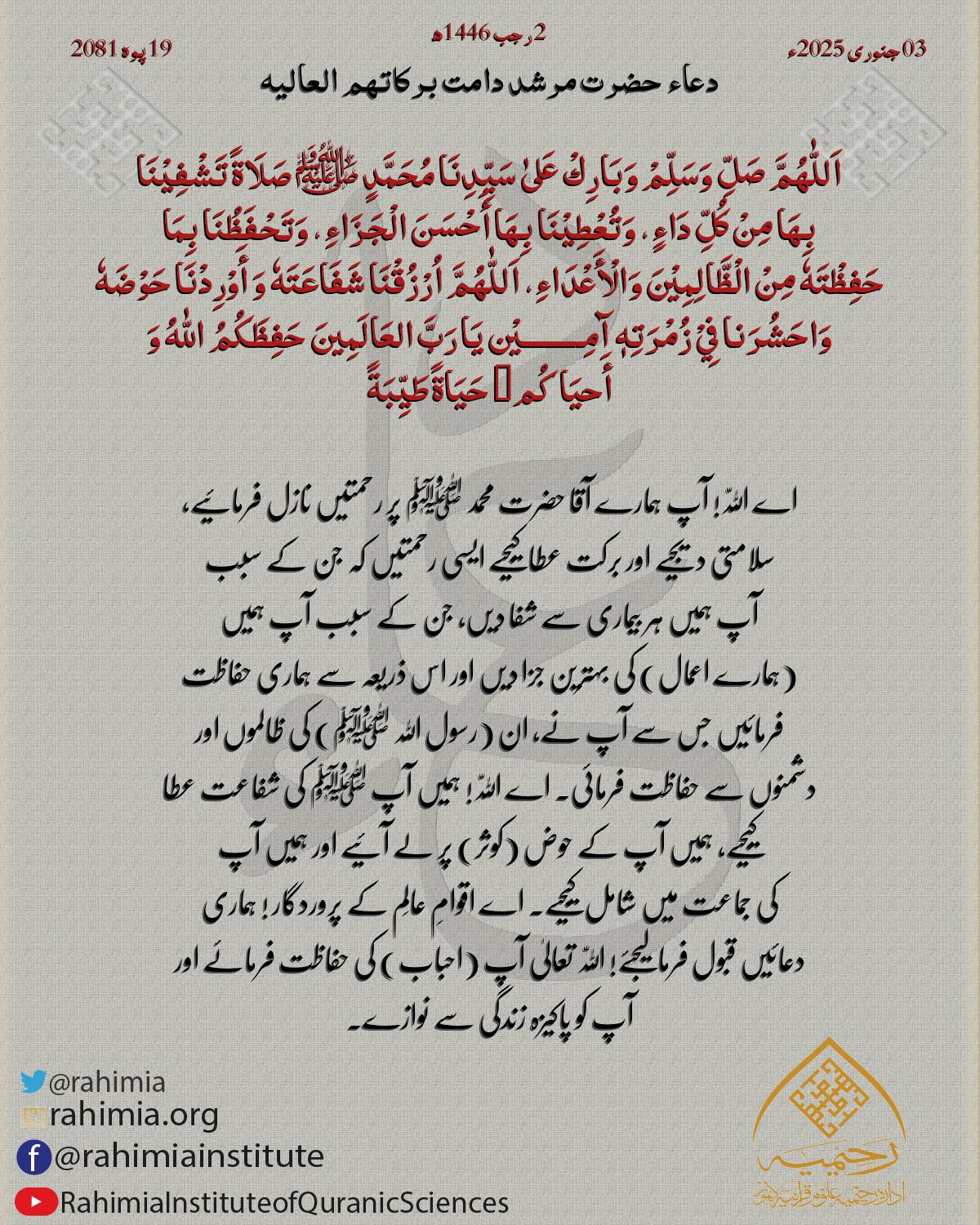 اَللّٰهُمَّ صَلِّ وَسَلِّمْ وَبَارِكْ عَلیٰ سَیِّدِنَا مُحَمَّدٍ ﷺ صَلَاةً تَشْفِیْنَا بِھَا مِنْ کُلِّ دَاءٍ، وَتُعْطِیْنَا بِھَا أَحْسَنَ الْجَزَاءِ، وَتَحْفَظُنَا بِمَا حَفِظْتَهٗ مِنْ الْظَّالِمِیْنَ وَالْأَ…