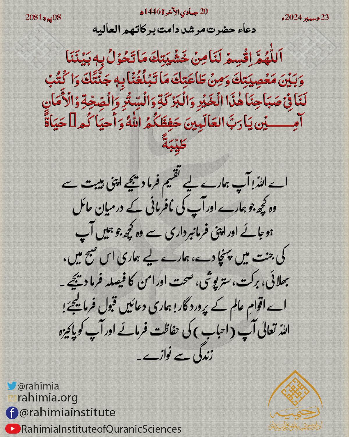 اَللّٰهُمَّ اِقْسِمْ لَنَا مِنْ خَشْیَتِكَ مَا تَحُوْلُ بِهٖ بَیْنَنَا وَبَیْنَ مَعْصِیَتِكَ وَمِنْ طَاعَتِكَ مَا تَبْلُغُنْا بِهٖ جَنَّتََكَ وَاکْتُبْ لَنَا فِیْ صَبَاحِنَا ھٰذَا الْخَیْرِ وَالْبَرْکَةِ وَالْسِّ…