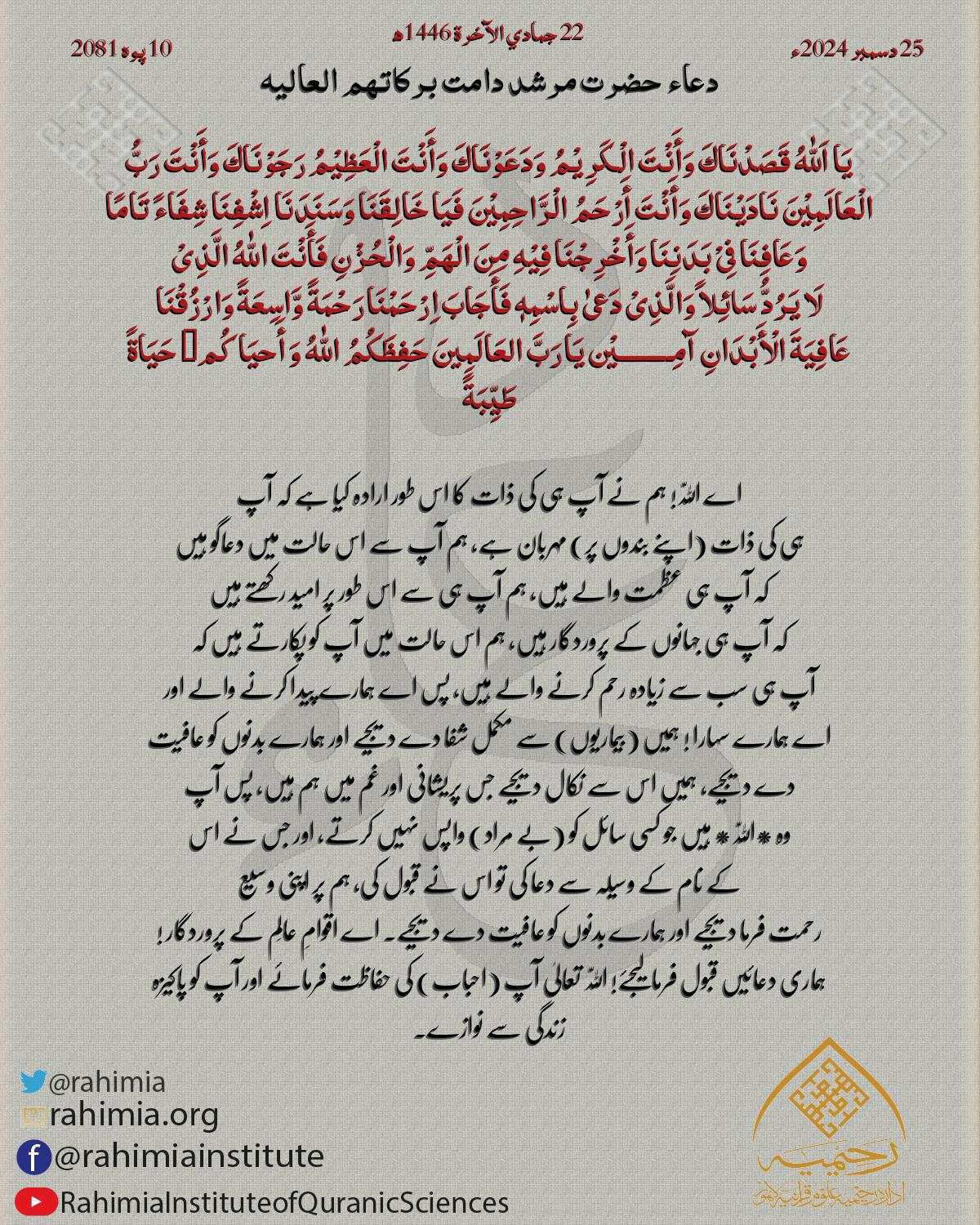 یَا اَللّٰهُ قَصَدْنَاكَ وَأَنْتَ الْکَرِیْمُ وَدَعَوْنَاكَ وَأَنْتَ الْعَظِیْمُ رَجَوْنَاكَ وَأَنْتَ رَبُّ الْعَالَمِیْنَ نَادَیْنَاكَ وَأَنْتَ أَرْحَمُ الْرَّاحِمِیْنَ فَیَا خَالِقَنَا وَسَنَدَنَا اِشْفِ…