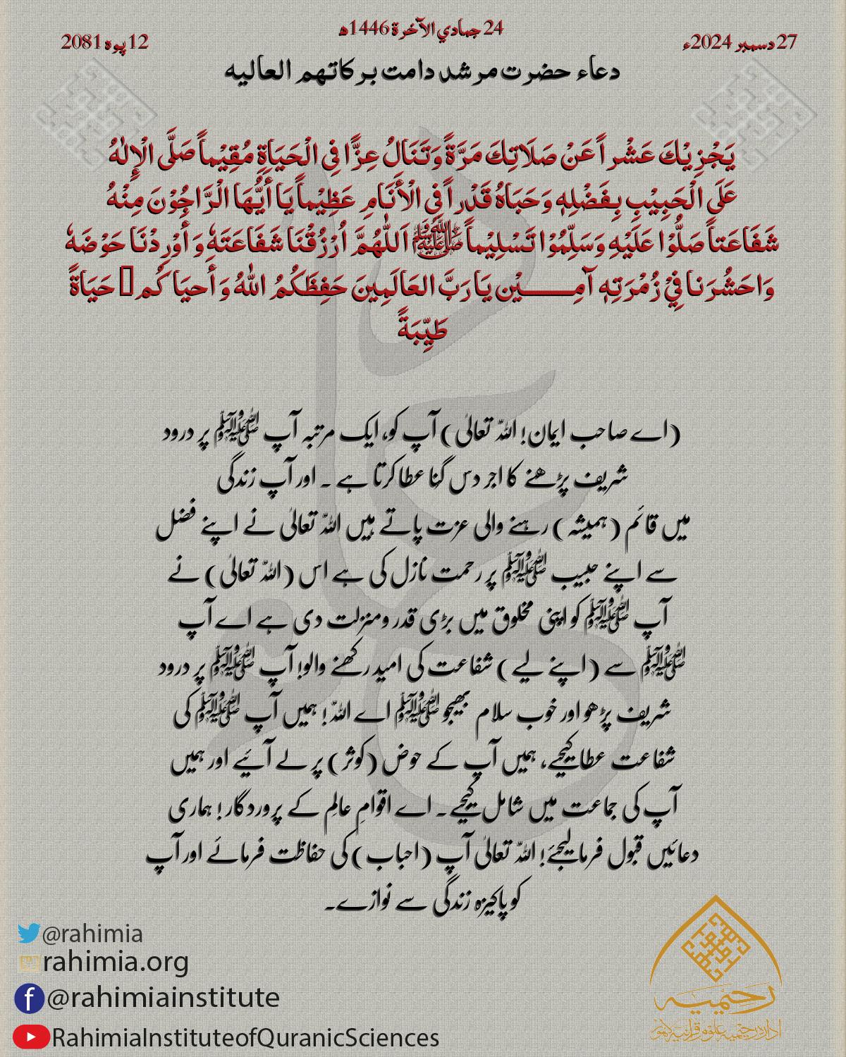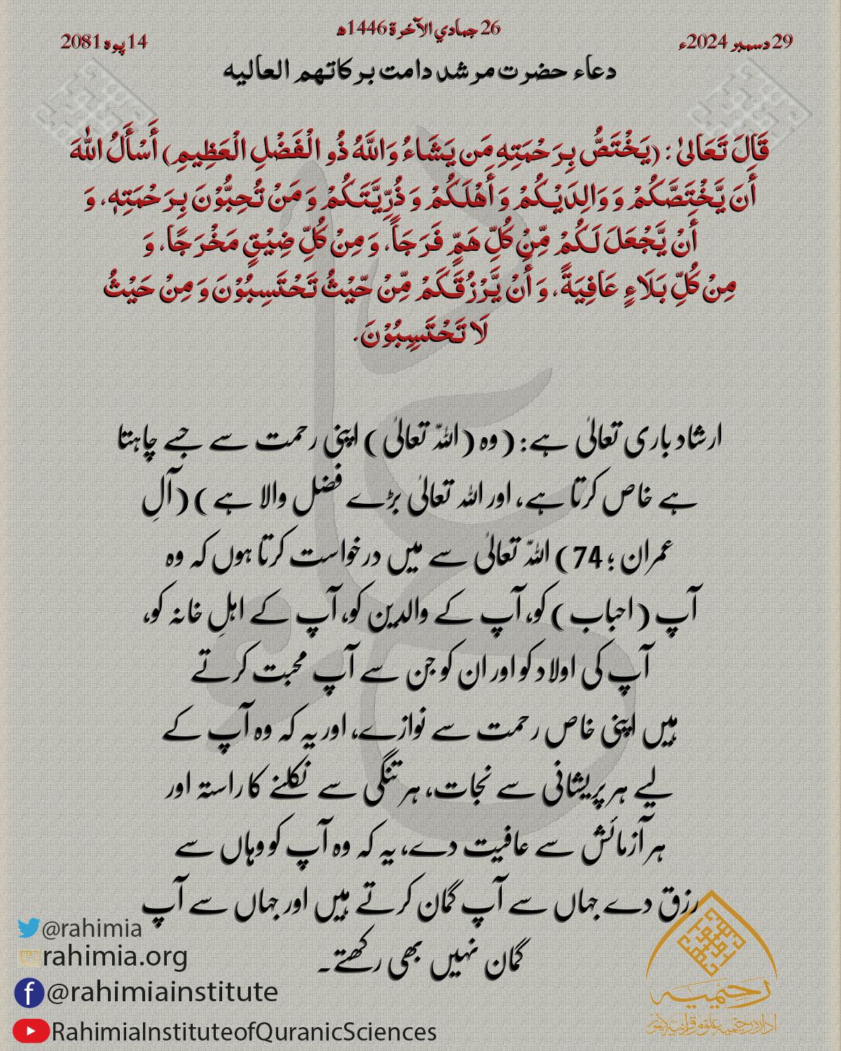قَالَ تَعَالىٰ : (يَخْتَصُّ بِرَحْمَتِهِ مَن يَشَاءُ وَاللَّهُ ذُو الْفَضْلِ الْعَظِيمِ) أَسْأَلُ اللّٰهَ أَنَ يَّخْتَصَّكُمْ وَ وَالِدَيْكُمْ وَ أَهْلَكُمْ وَ ذُرِّيَّتَكُمْ وَ…