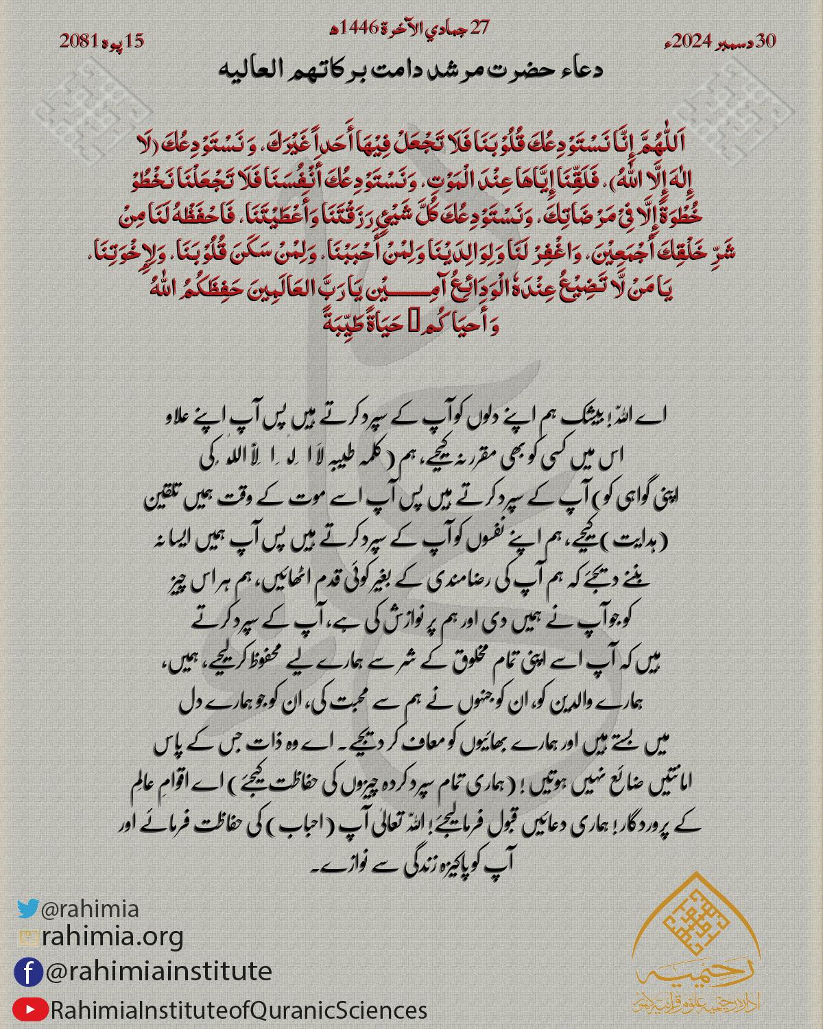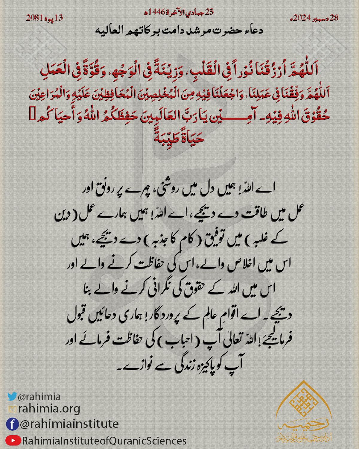 اَللّٰهُمَّ اُرْزُقْنَا نُوْراً فِی الْقَلْبِ، وَزِیْنَةً فِی الْوَجْھِ، وَقُوَّةً فِی الْعَمَلِ اَللّٰهُمَّ وَفِّقْنَا فِی عَمَلِنَا، وَاجْعَلْنَا فِیْهِ مِنَ الْمُخْلِصِیْنَ الْمُحَافِظِیْنَ عَلَیْهِ وَالْمُرَ…