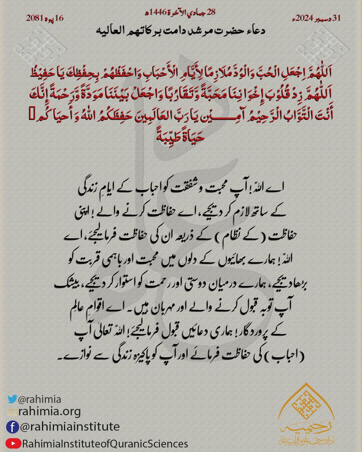 اَللّٰهُمَّ اِجْعَلِ الْحُبَّ وَالْوُدَّ مُلَازِمًا لِأَیَّامِ الْأَحْبَابِ وَاحْفَظْھُمْ بِحِفْظِكَ یَا حَفِیْظُ اَللّٰهُمَّ زِدْ قُلُوْبَ إِخْوَانِنَا مَحَبَّةً وَّتَقَارُبًا وَاجْعَلْ بَیْنَنَا مَوَدَّةً وَّرَحْ…
