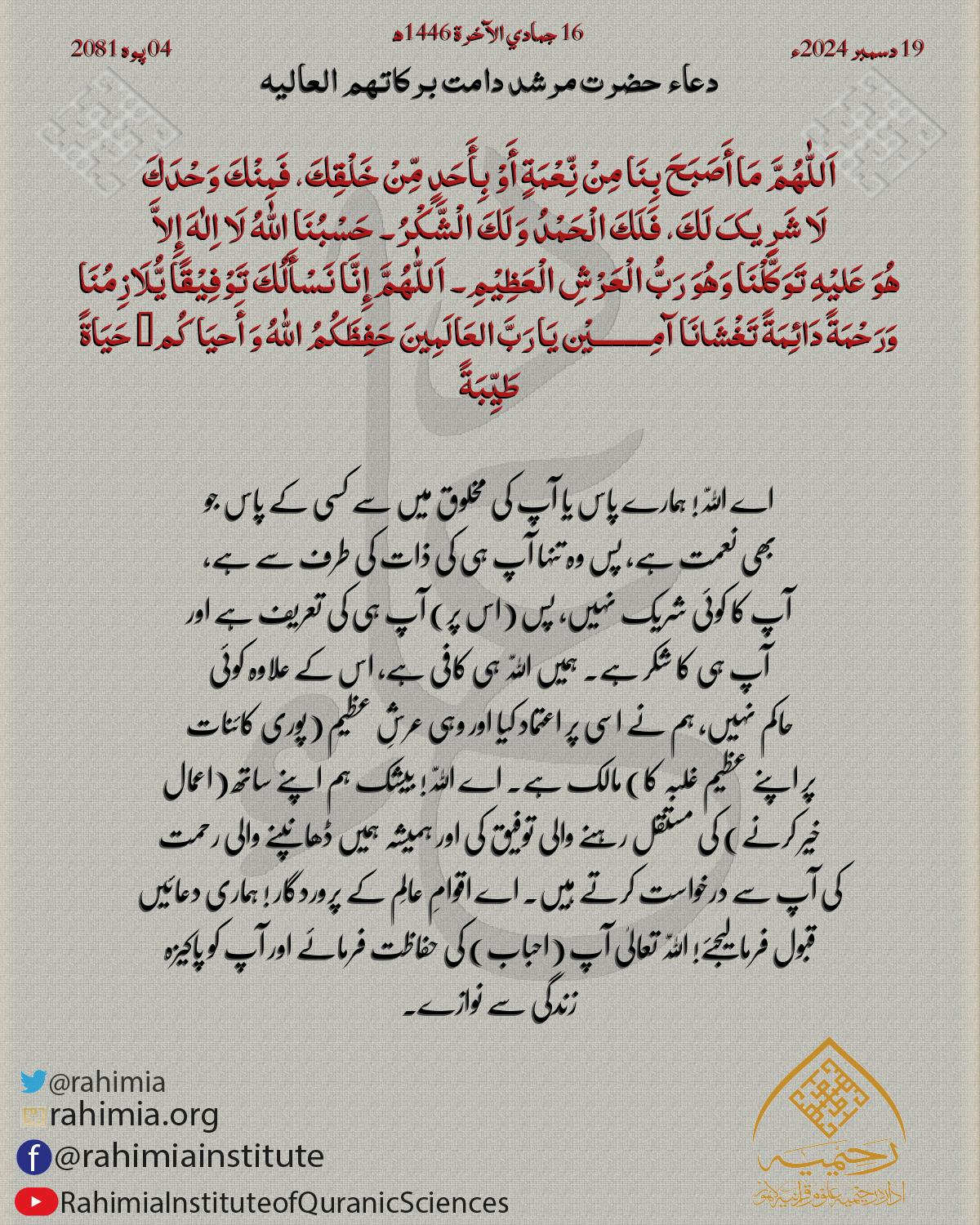 اَللّٰهُمَّ مَا أَصَبَحَ بِنَا مِنْ نِّعْمَةٍ أَوْ بِأَحَدٍ مِّنْ خَلْقِكَ، فَمِنْكَ وَحْدَكَ لَا شَرِیکَ لَكَ، فَلَكَ الْحَمْدُ وَلَكَ الْشَّکْرُ۔ حَسْبُنَا اللّٰهُ لَا اِلٰهَ إِلاَّ ھُوَ عَلیْهِ تَوَکَّلْنَ…