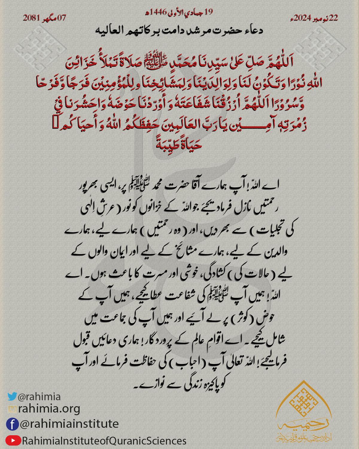 اَللّٰهُمَّ صَلِّ عَلیٰ سَیِّدِنَا مُحَمَّدٍ ﷺ صَلَاةً تَمْلَأُ خَزَائِنَ اللّٰهِ نُوْرًا وَتَکُوْنُ لَنَا وَلِوَالِدَیْنَا وَلِمَشَائِخِنَا ولِلْمُؤْمِنِیْنَ فَرَجًا وَّفَرْحّا وَّسُرُوْرًا اَللّٰهُمَّ اُرْزُقْنَا شَفَ…