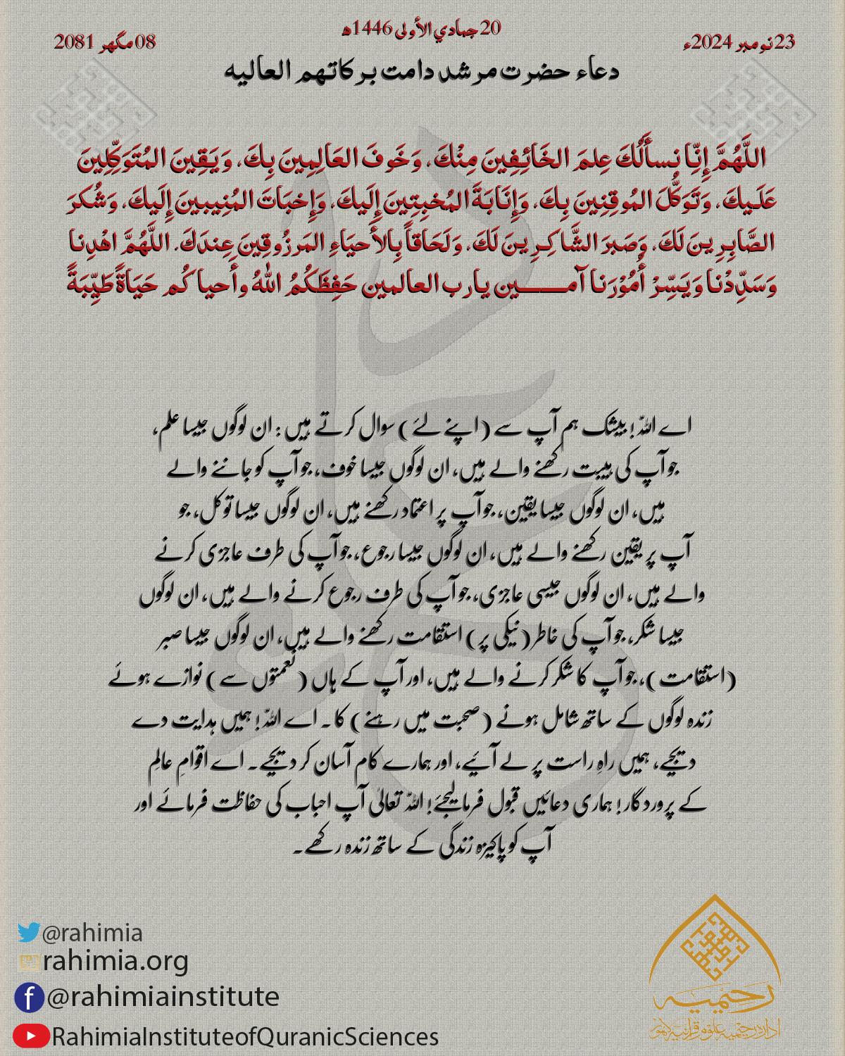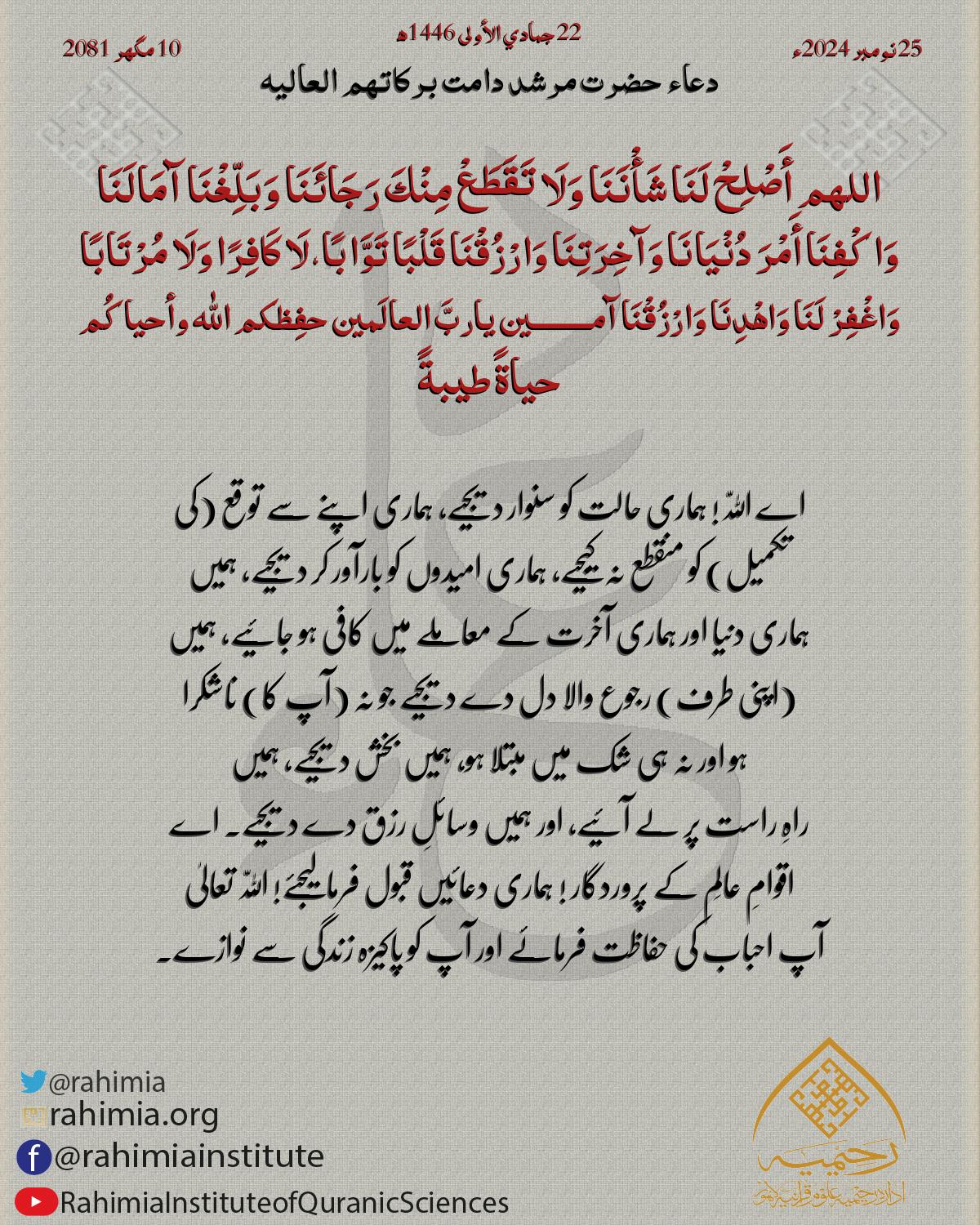 اللهم أِنَّا نَسْئَلُكَ قِطَافًا مِّنَ السَّعَادَةِ وَثِمَارًا مِّنَ الْمَسَرَّةِ، وَخَیْرًا یُّلَازِمُ أَیَّامَنَا وَلُطْفًا یَّضُمُ أَرْوَاحَنَا آمین یارب العالمین حَفِظَکُم اللّٰهُ وأح…