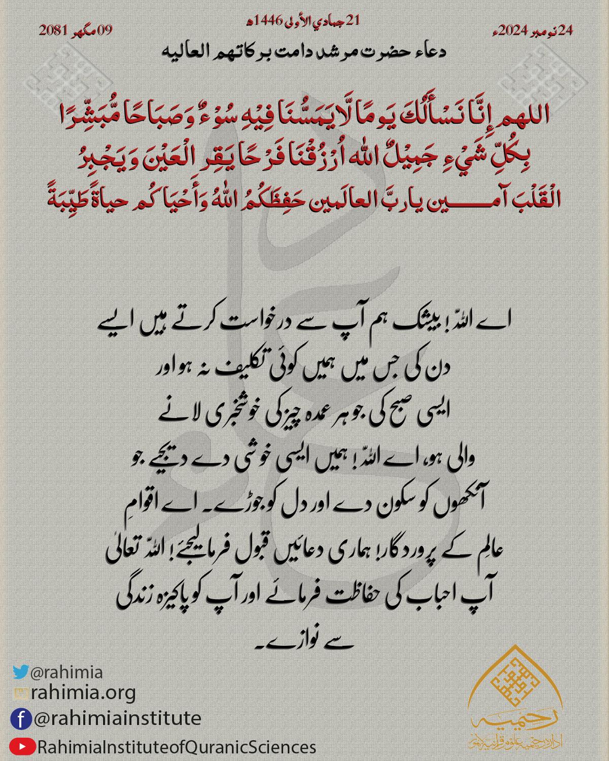 اللهم إِنَّا نَسْأَلُكَ يَومًا لَّايَمَسُّنَا فِيْهِ سُوْءٌ وَصَبَاحًا مُّبَشِّرًا بِكُلِّ شَيْءِ جَمِيْلٌ الله اُرْزُقْنَا فَرْحًا يَقِر الْعَيْنَ وَيَجْبِرُ الْقَلْبَ آمـــــــــين …