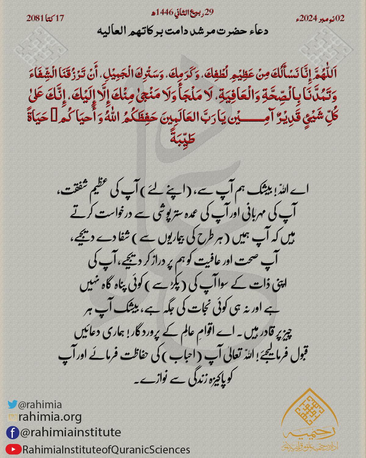 اَللّٰھُمَّ اِقْضِ حَوَائِجَنَا وَحَقِّقْ مُرَادَنَا وَاجْبُرْ خَوَاطِرَنَا وَاصْرِفْ عَنَّا کُلَّ شَرٍّ اَللّٰھُمَّ ھَبْ لَنَا نُفُوْسًا رَاضِیَةً وَصُدُوْرًا مِّنَ الْھُمُوْمِ خَالِیَةً وَقُلُوْبًا بِحُبِّكَ صَا…