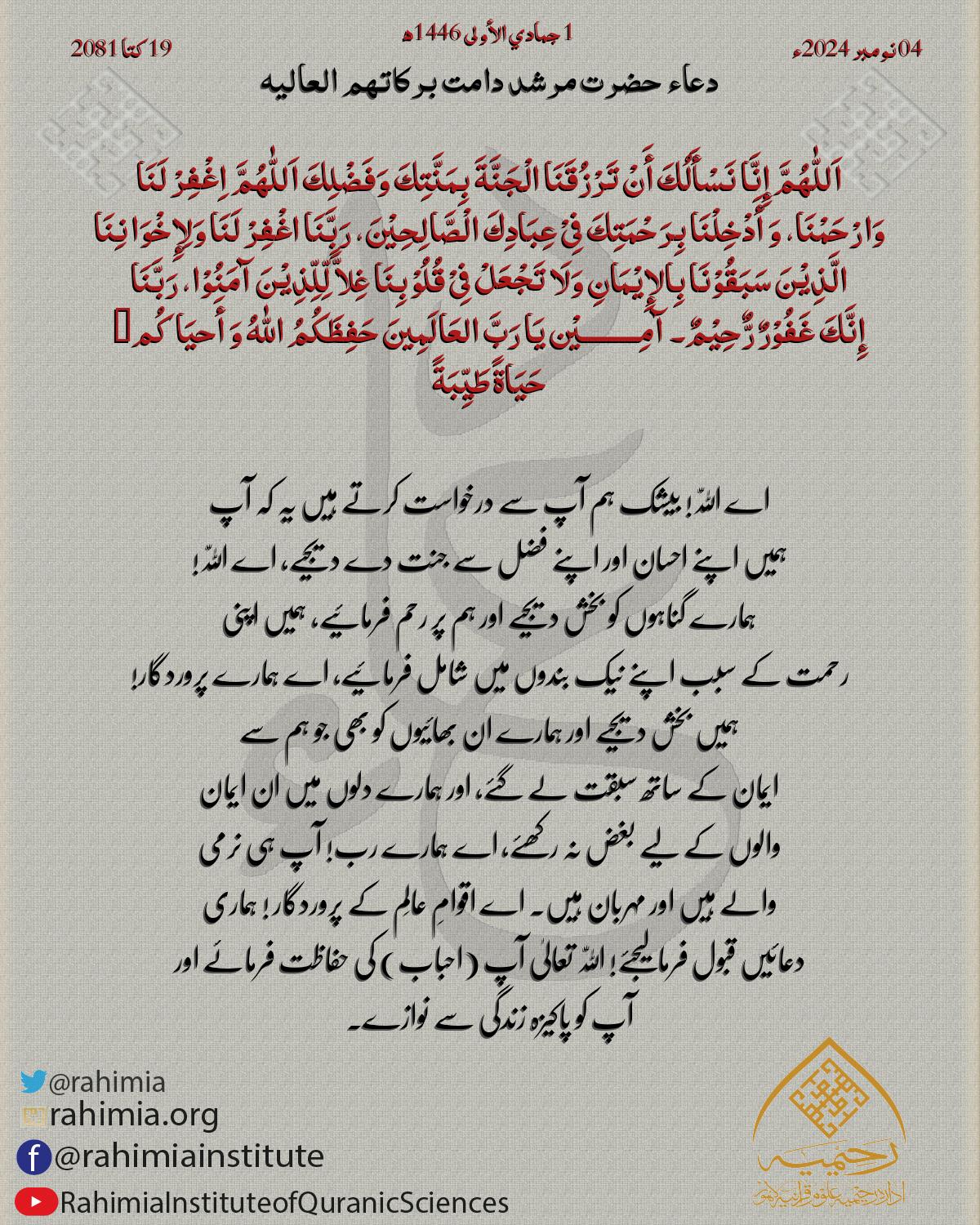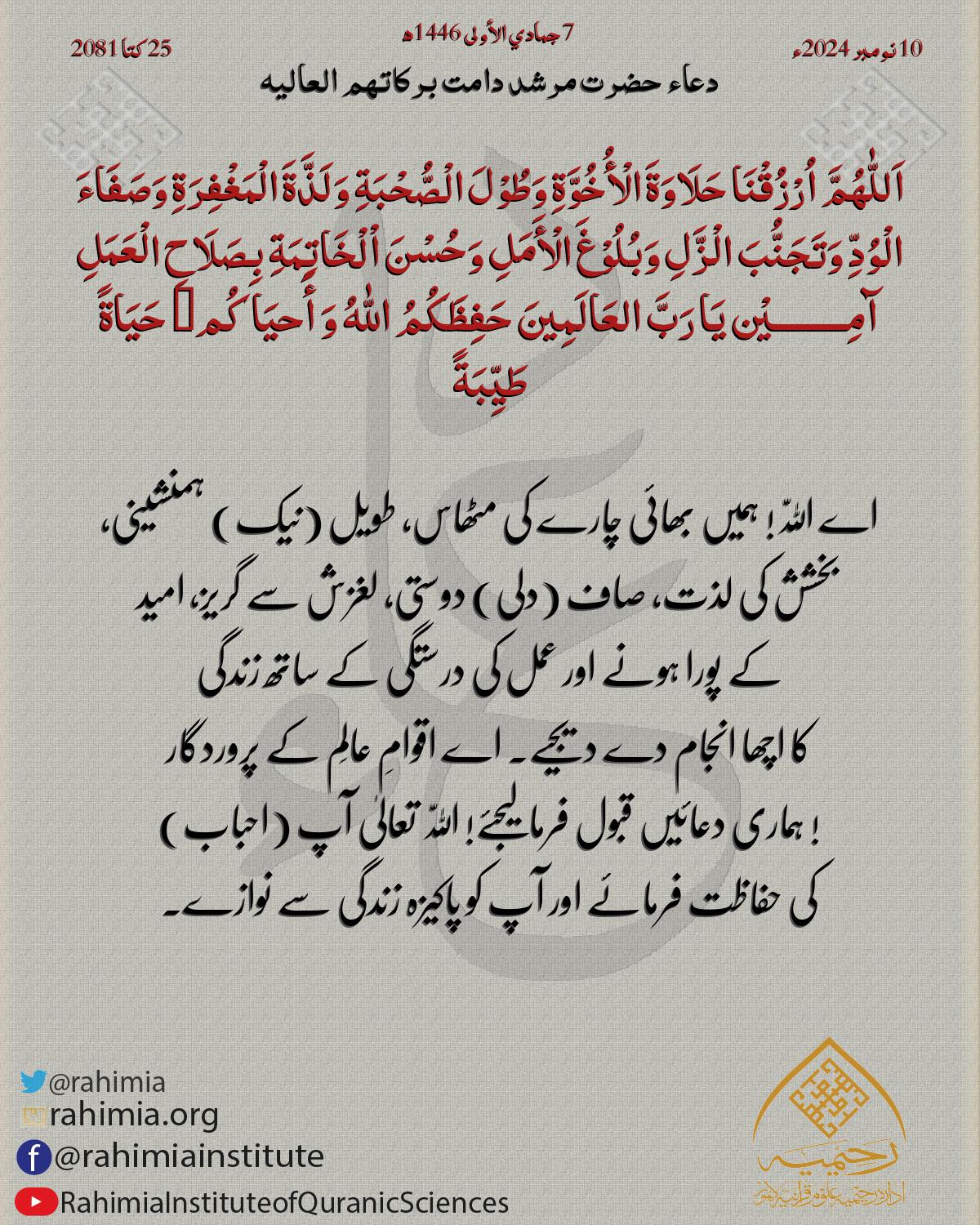 اَللّٰهُمَّ اُرْزُقْنَا حُلُوَّ الْحَیَاةِ وَخَیْرَ الْعَطَاءِ وَسَعَةَ الْرِّزْقِ وَرَاحَةَ الْبَالِ وَلِبَاسَ الْعَافِیَةِ وَحُسْنَ الْخَاتِمَةِ آمِـــــــــيْن يَا رَبَّ العَالَمِينَ حَفِظَكُمُ ا…