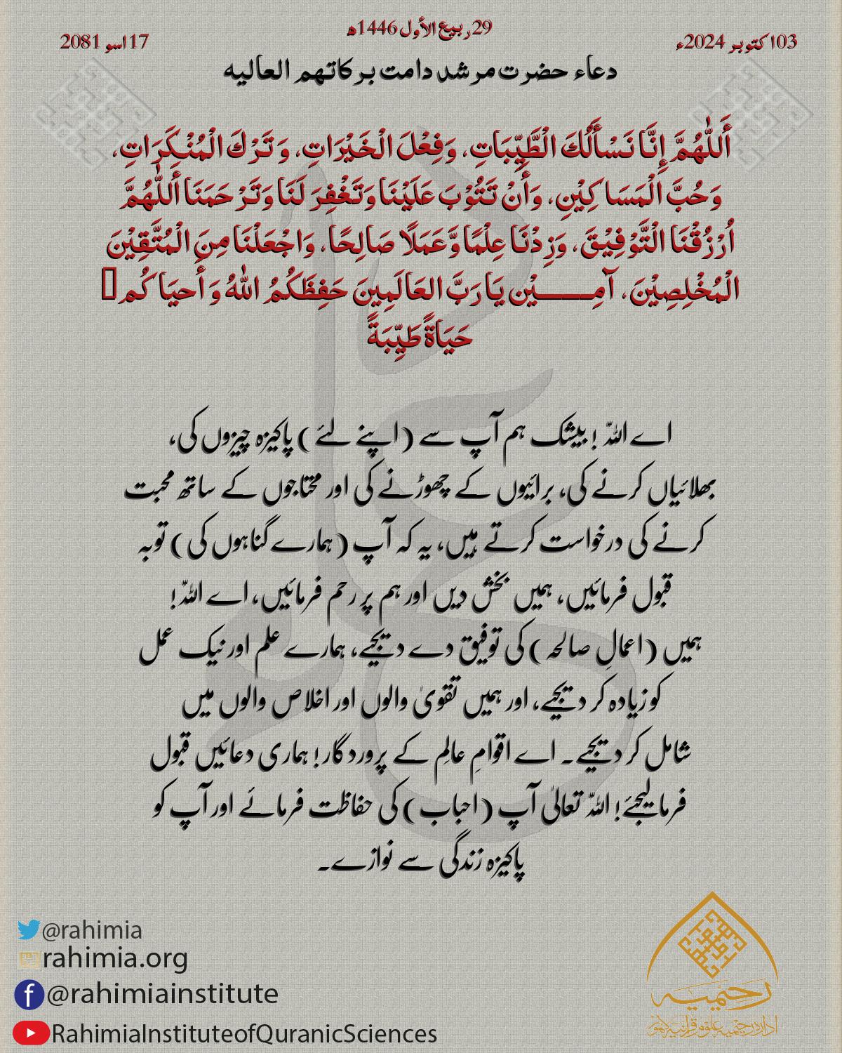 أَللّٰھُمَّ إِنَّا نَسْأَلُكَ الْطَّیِّبَاتِ، وَفِعْلَ الْخَیْرَاتِ، وَ تَرْكَ الْمُنْکَرَاتِ، وَحُبَّ الْمَسَاکِیْنِ، وَأَنْ تَتُوْبَ عَلَیْنَا وَتَغْفِرَ لَنَا وَتَرْحَمَنَا أَللّٰھُمَّ اُرْزُقْنَا الْتَّوْفِیْقَ، وَ…