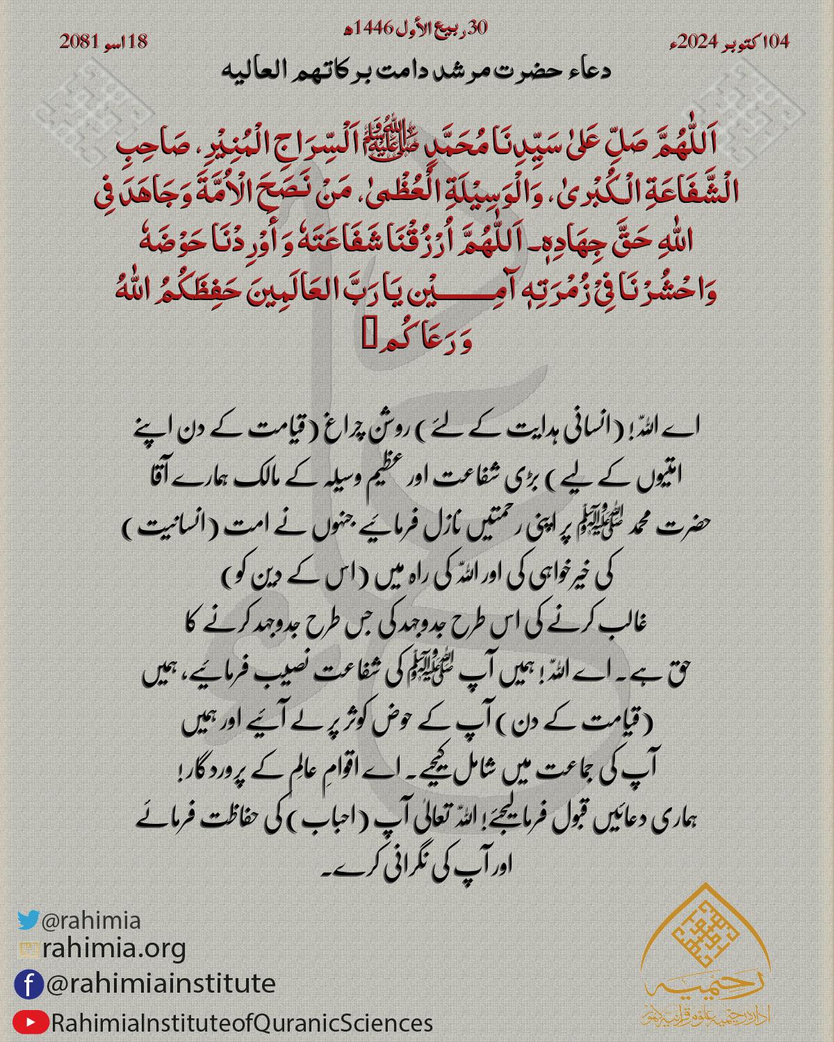 اَللّٰھُمَّ صَلِّ عَلیٰ سَیِّدِنَا مُحَمَّدٍ ﷺ اَلْسِّرَاجِ الْمُنِیْرِ، صَاحِبِ الْشَّفَاعَةِ الْکُبْریٰ، وَالْوَسِیْلَةِ الْعُظْمیٰ، مَنْ نَصَحَ الْاُمَّةَ وَجَاھَدَ فِی اللّٰهِ حَقَّ جِھَادِهٖ۔ اَللّٰھُمَّ اُرْزُ…