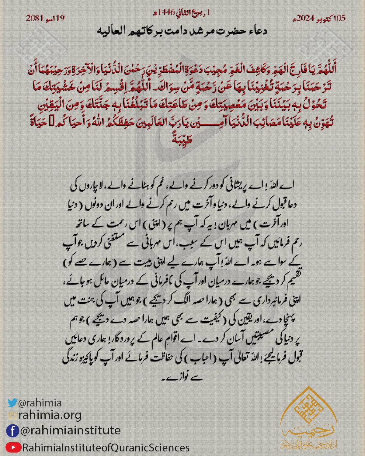 أَللّٰھُمَّ یَا فَارِجَ الْھَمِّ وَکَاشِفَ الْغَمِّ مُجِیْبَ دَعْوَةِ الْمُضْطَرِّیْنَ رَحْمٰنَ الْدُّنْیَا وَالْآخِرَةِ وَرَحِیْمَھُمَا أَنْ تَرْحَمَنَا بِرَحْمَةٍ تُغْنِیْنَا بِھَا عَنْ رَّحْمَةٍ مَّنْ سِوَاكَ۔ أَ…