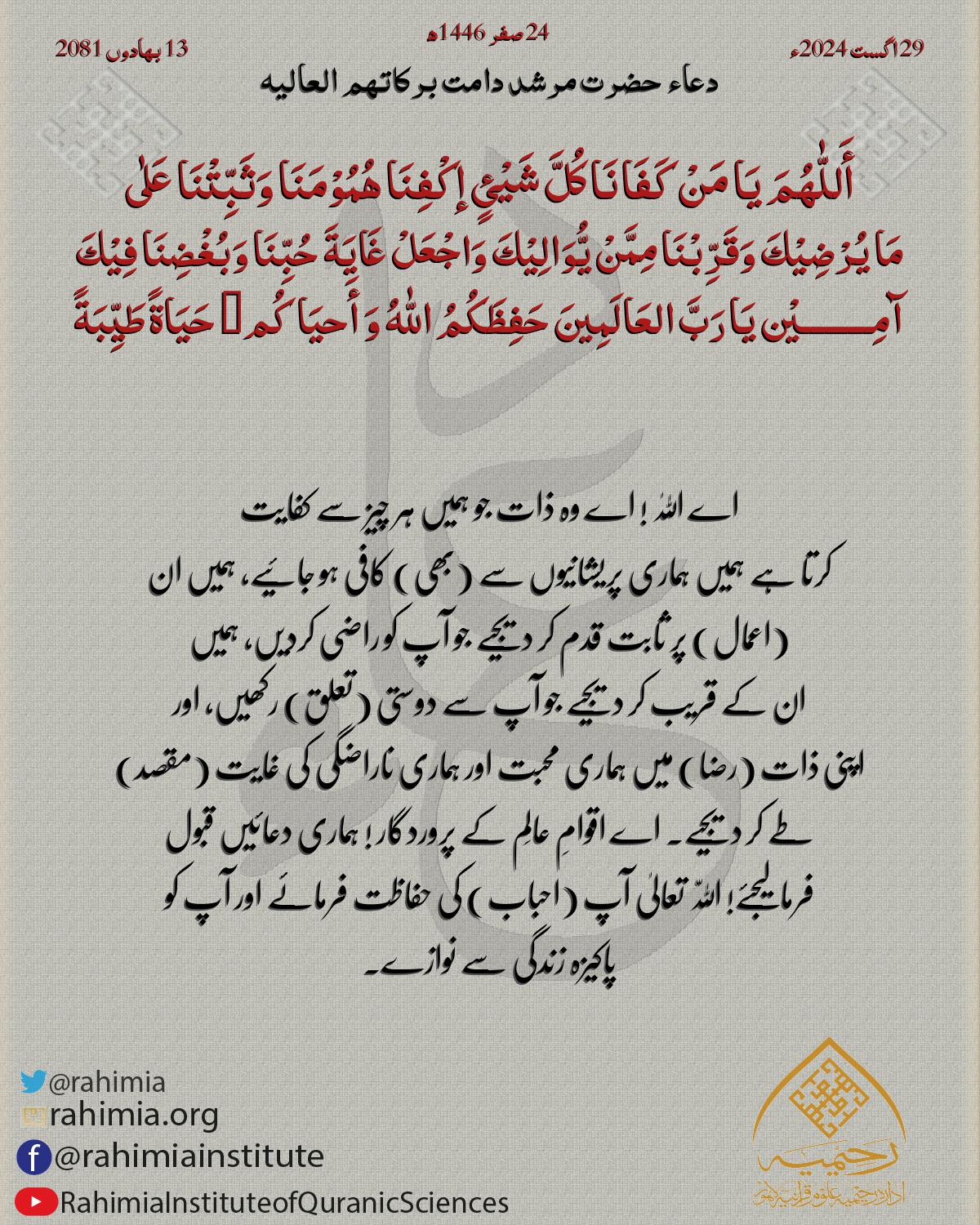 أَللّٰھُمَ یَا مَنْ کَفَانَا کُلَّ شَیْئٍ إکْفِنَا ھُمُوْمَنَا وَثَبِّتْنَا عَلٰی مَا یُرْضِیْكَ وَقَرِّبْنَا مِمَّنْ یُّوَالِیْكَ وَاجْعَلْ غَایَةَ حُبِّنَا وَبُغْضِنَا فِیْكَ آمِـــــــــيْن …