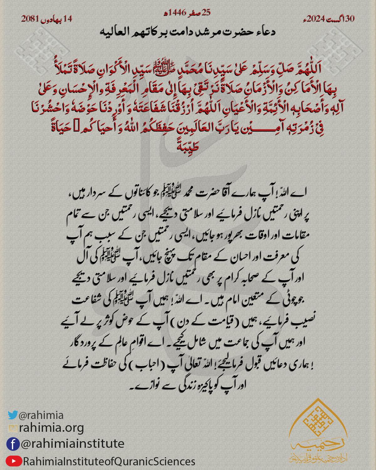 اَللّٰھُمَّ صَلِّ وَسَلِّمْ عَلیٰ سَیِّدِنَا مُحَمَّدٍ ﷺ سَیِّدِ الْأَکْوَانِ صَلَاةً تَمْلَأُ بِھَا الْأَمَاکِنُ وَالْأَزْمَانُ صَلَاةً نَرْتَقِیْ بِھَا إِلٰی مَقَامِ الْمَعْرِفَةِ والْإِحْسَانِ وَعَلیٰ آلِ…
