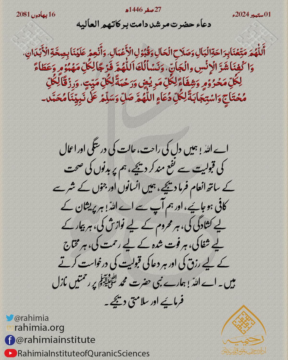 أَللّٰھُمَّ یَا مَنْ تَوَزَّعَتِ الْأَرْزَاقُ بِکَرَمِهٖ، وَتَنَفَّسَتِ الْصُّبْحُ بِأَمْرِهٖ، بَلِّغْنَا أَسْمیٰ مَرَاتِبِ الْدُّنْیَا وَأعْلیٰ مَنَازِلِ الْآخِرَةِ۔ أَللّٰھُمَّ اُرْزُقْنَا إِجَابَةَ الْدُّ…