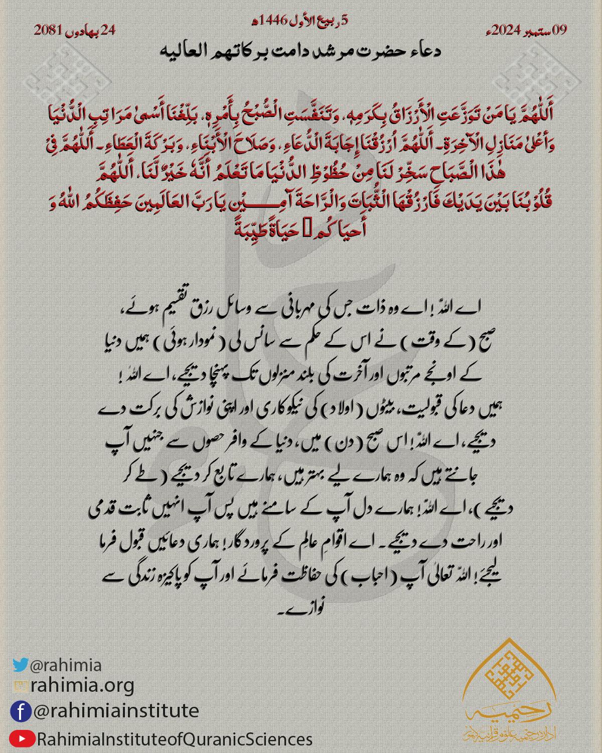 أَللّٰھُمَ یَا مُشْرِقَ الْصَّبَاحِ وَجَاعِلَ الْقُرْآنِ أَکْبَرُ إِیْضَاحٍ اِحْفَظْ أَحِبَّتِیْ فِیْ کُلِّ صَبَاحٍ، وَارْزُقْهُمُ الْجَنَّةَ وَالْفَلاَحَ ، صَبَاحُ ضَاحِكٍ سَعِیْدٍ یَرْسُمُ عَلٰی وُجُوْھِکُمْ …
